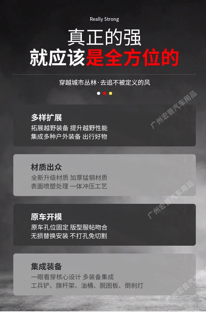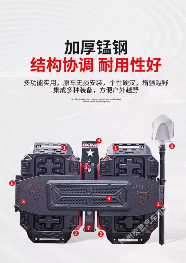 - Features a multi-functional mounting system for attaching recovery gear, tools, or outdoor equipment externally.