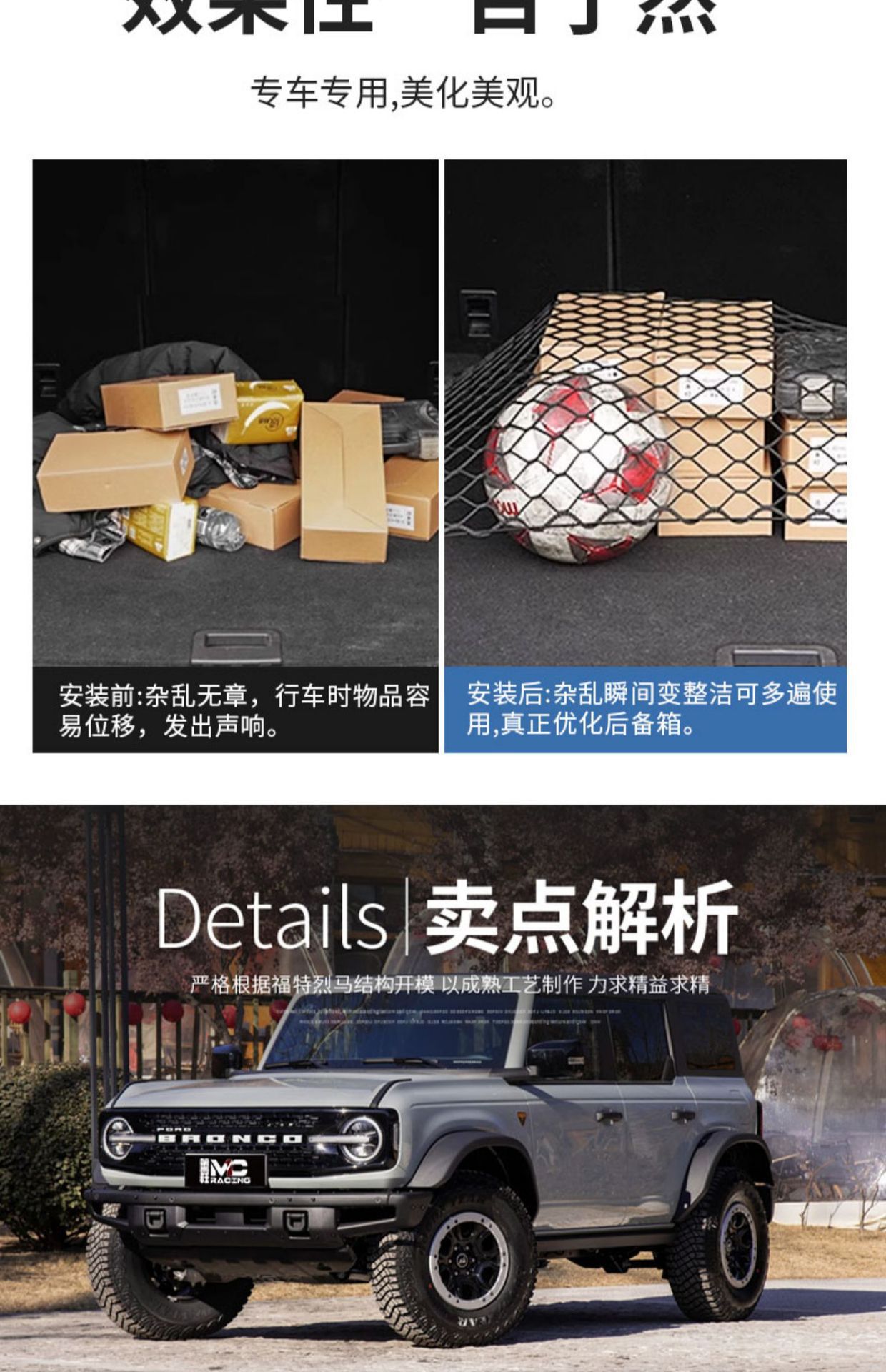 - Compatible with Ford Bronco models providing a secure fit for different cargo configurations in the rear trunk area.