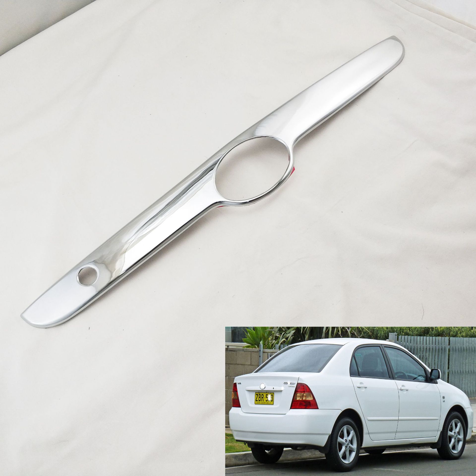 Upgrade your 2001-2004 Toyota Corolla with this high-quality rear trunk chrome trim. Durable electroplated finish provides a sleek look and easy adhesive install.