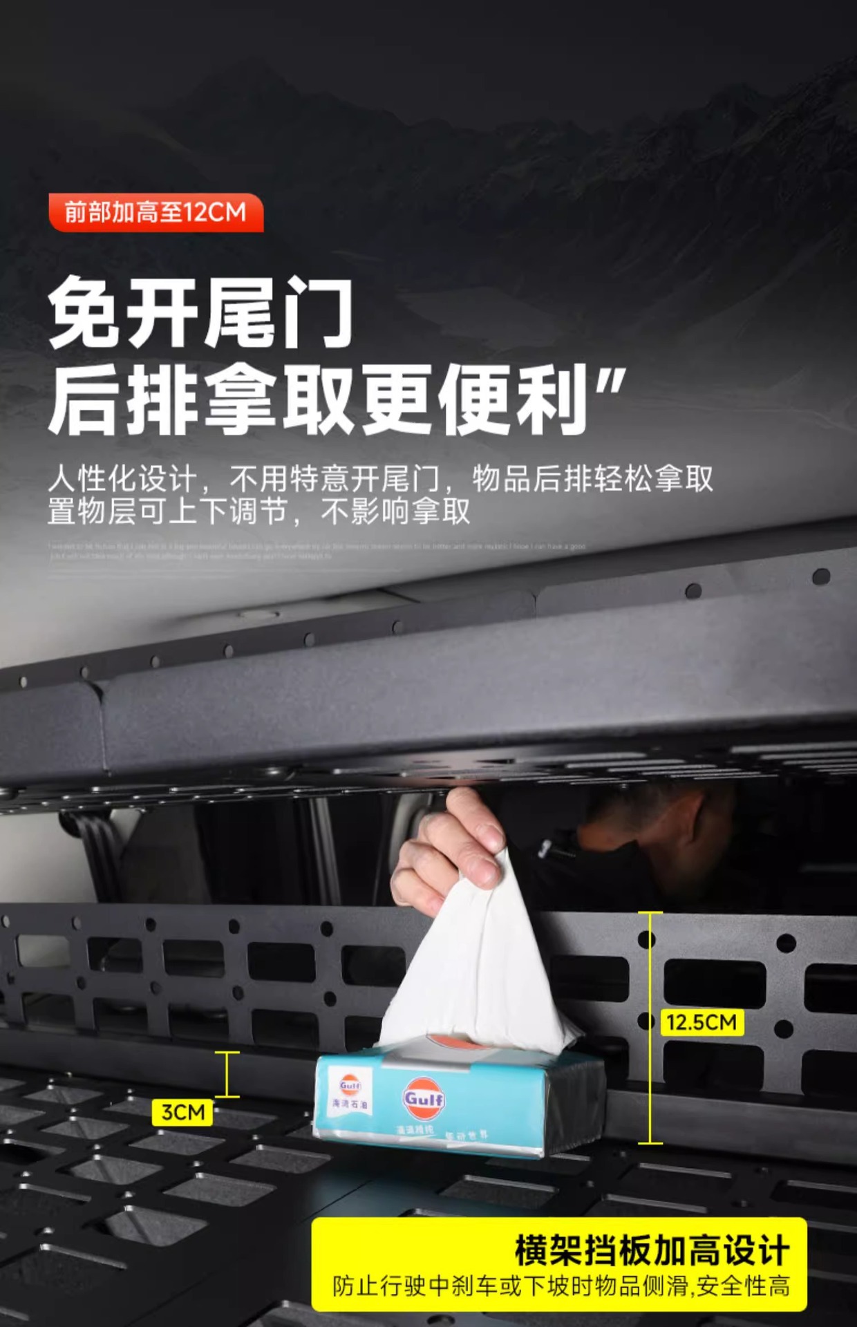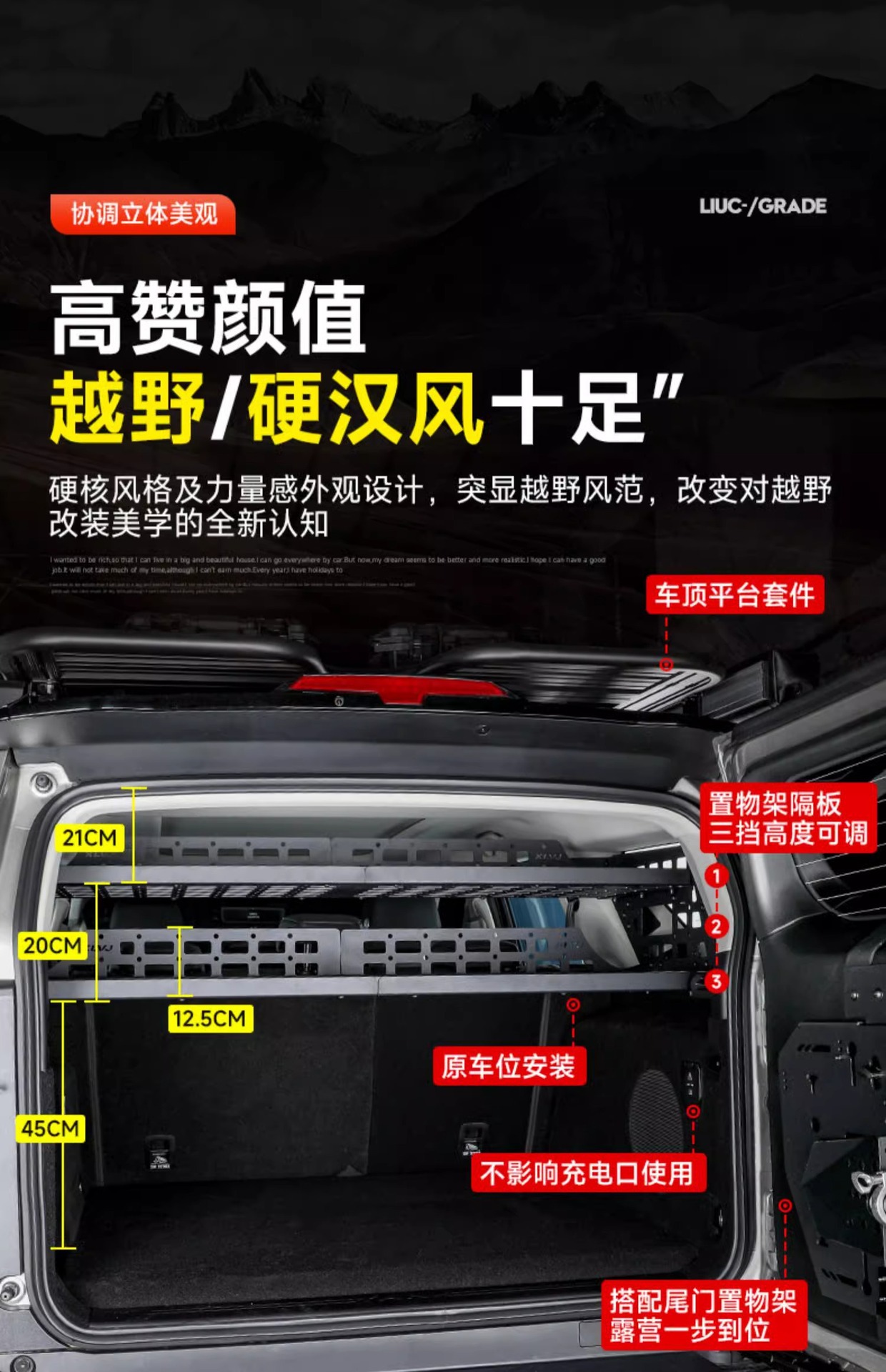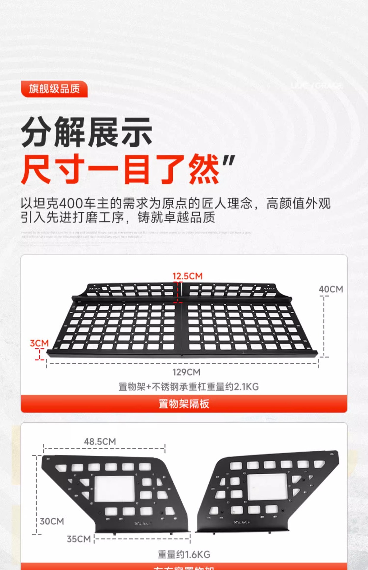 - Customized fitment specifically designed for the Tank 400 rear trunk side windows to maximize vertical storage space.