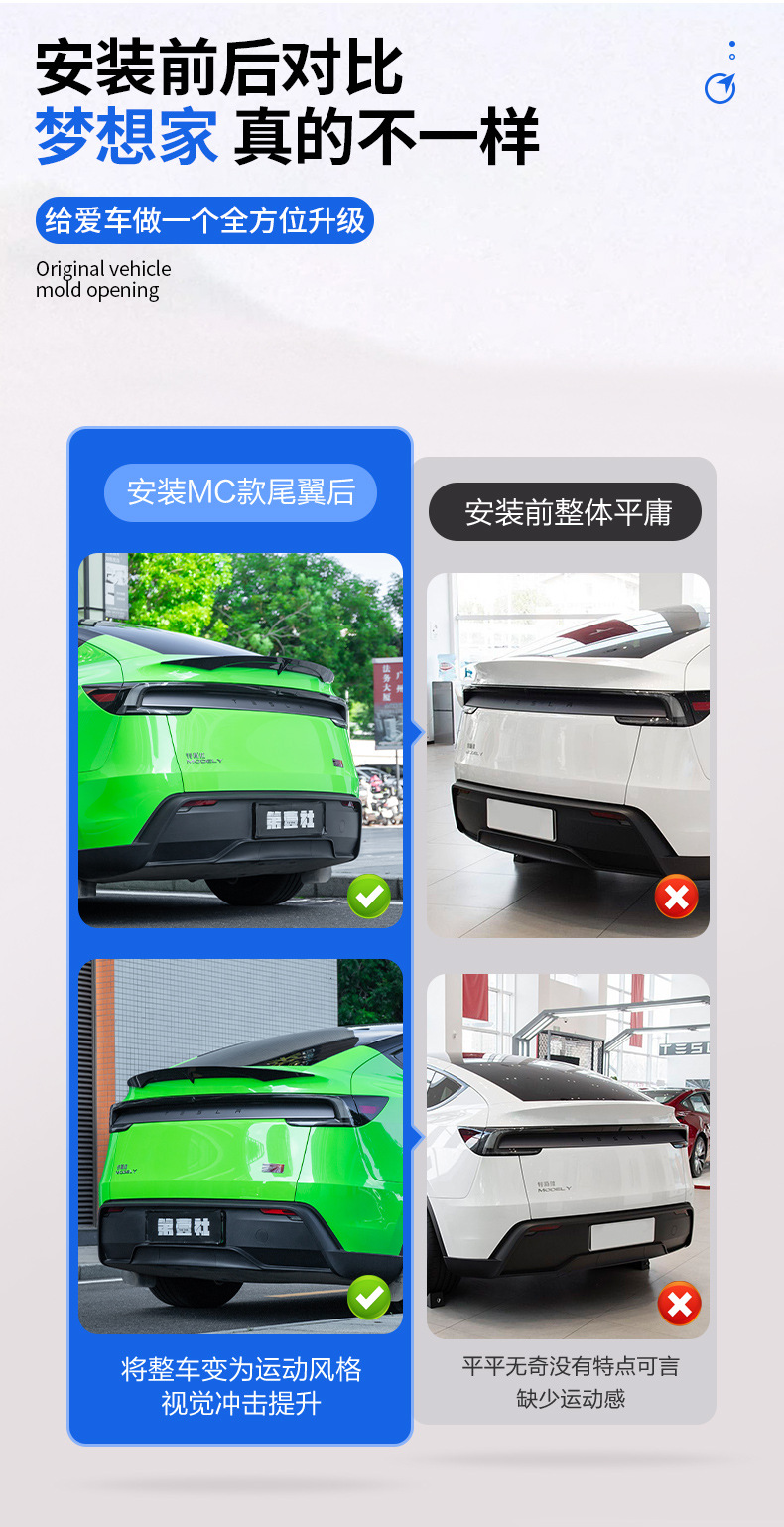 Tags: aerodynamic body kit, Lip Wing, Model Y Tuning, rear trunk spoiler, sport spoiler, Tail Wing Upgrade, Tesla Exterior Accessory