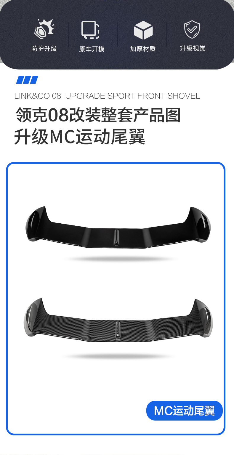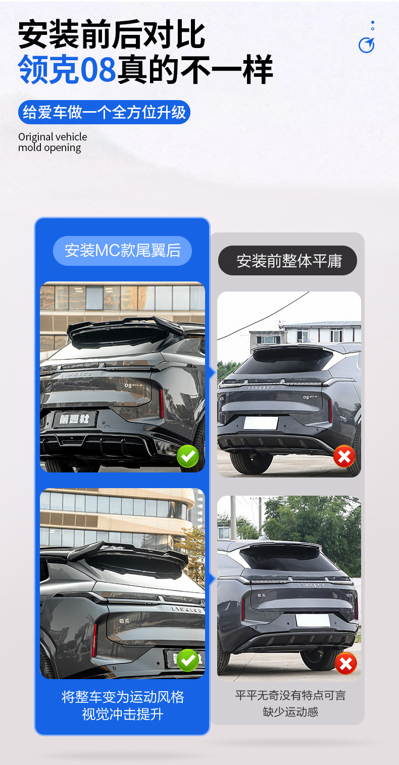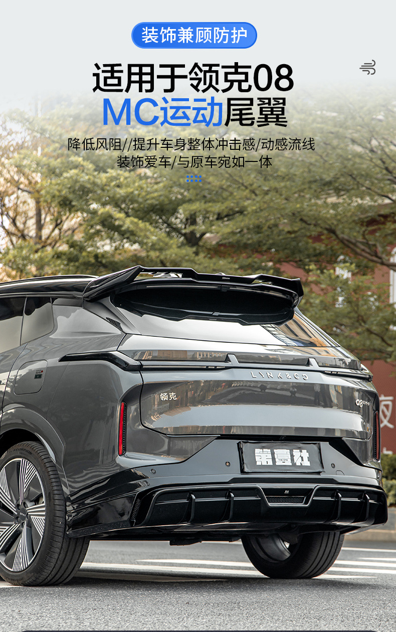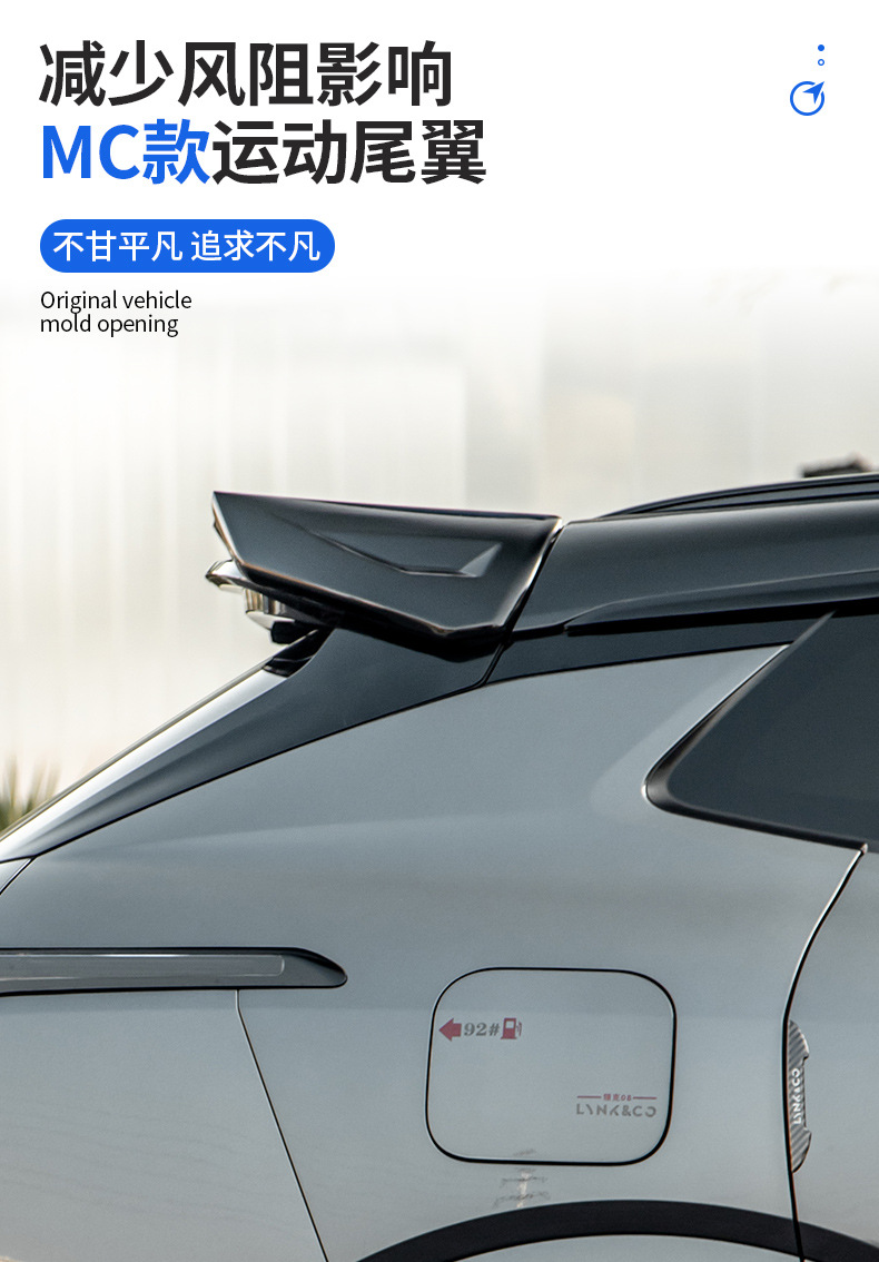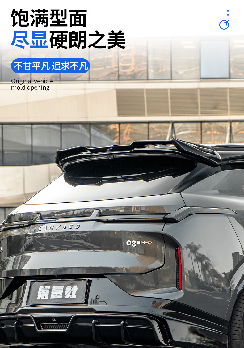 Upgrade your Lynk & Co 08 with this MC-style glossy black rear spoiler wing. Enhance aerodynamics and sport aesthetics with a durable, easy drill-free installation.