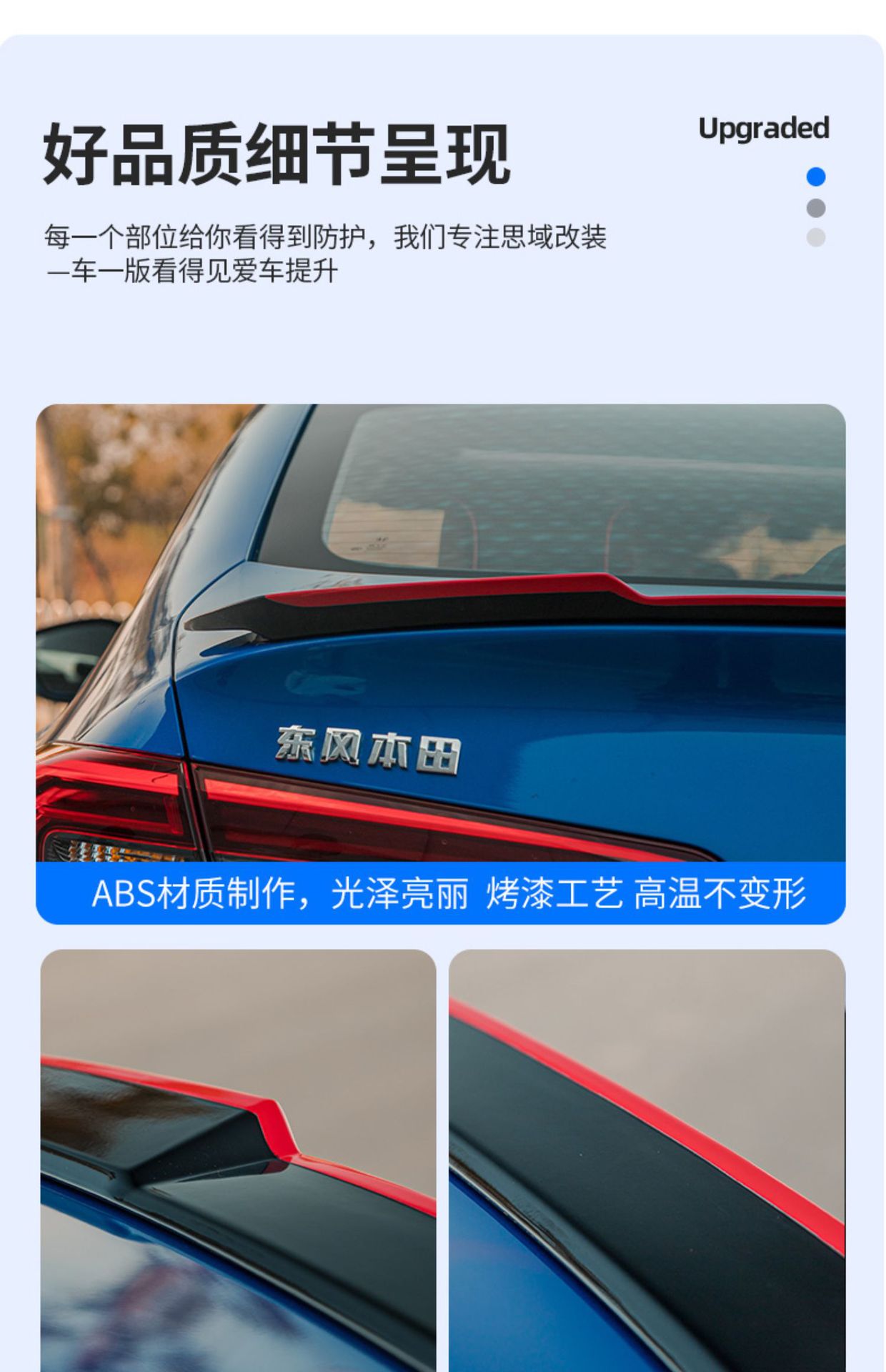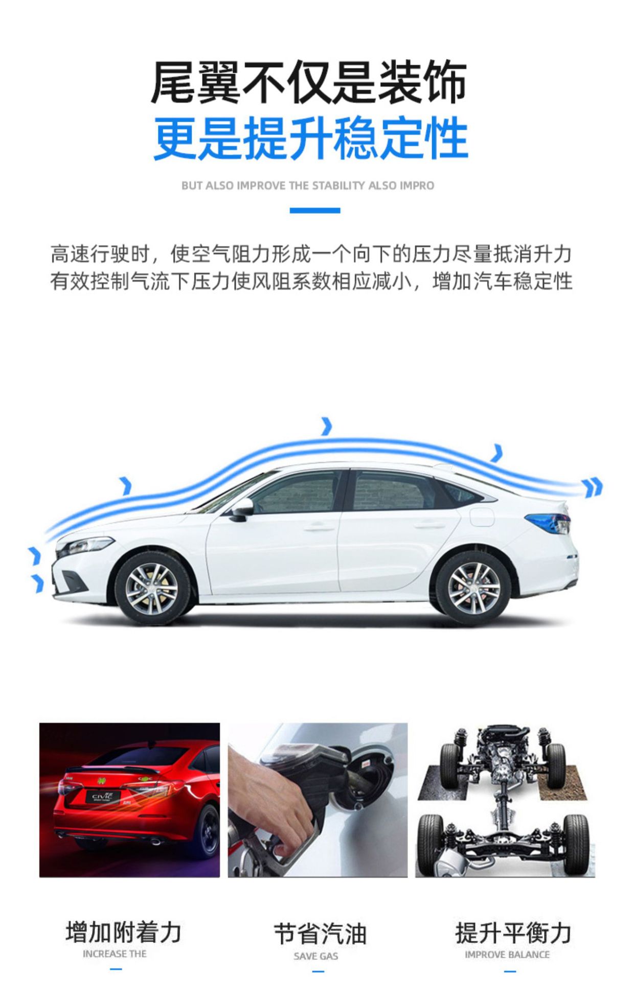 - Improves high-speed stability by increasing downforce and reducing air turbulence at the rear of the vehicle.