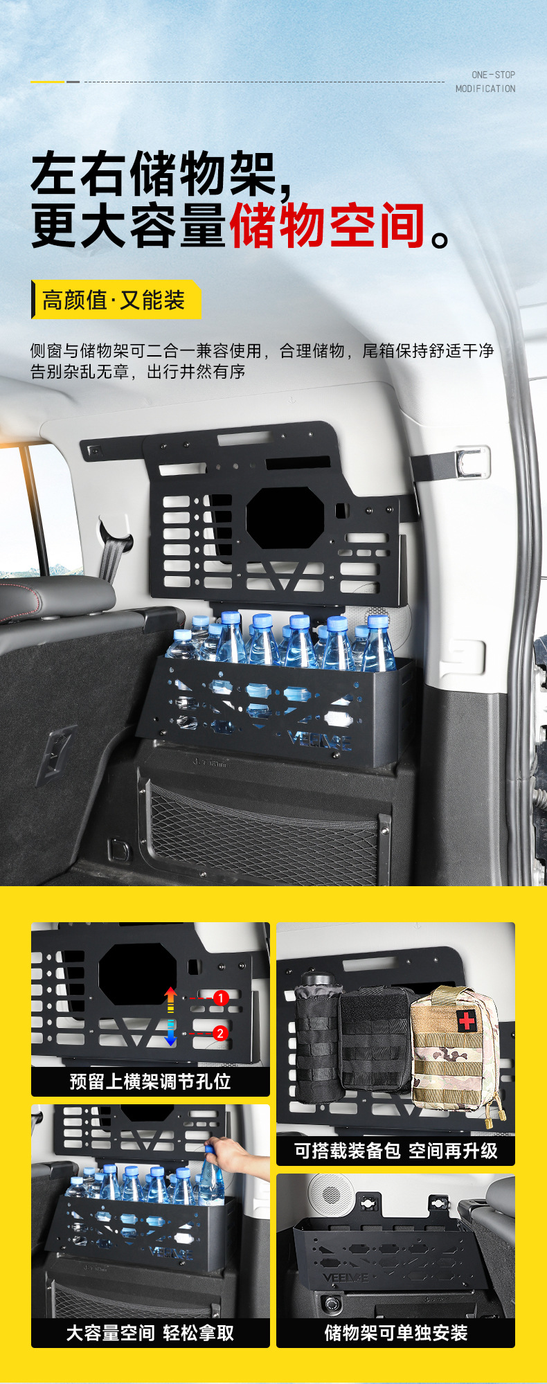 - Equipped with a practical expansion net to secure small items and prevent shifting during transit and off-road driving.