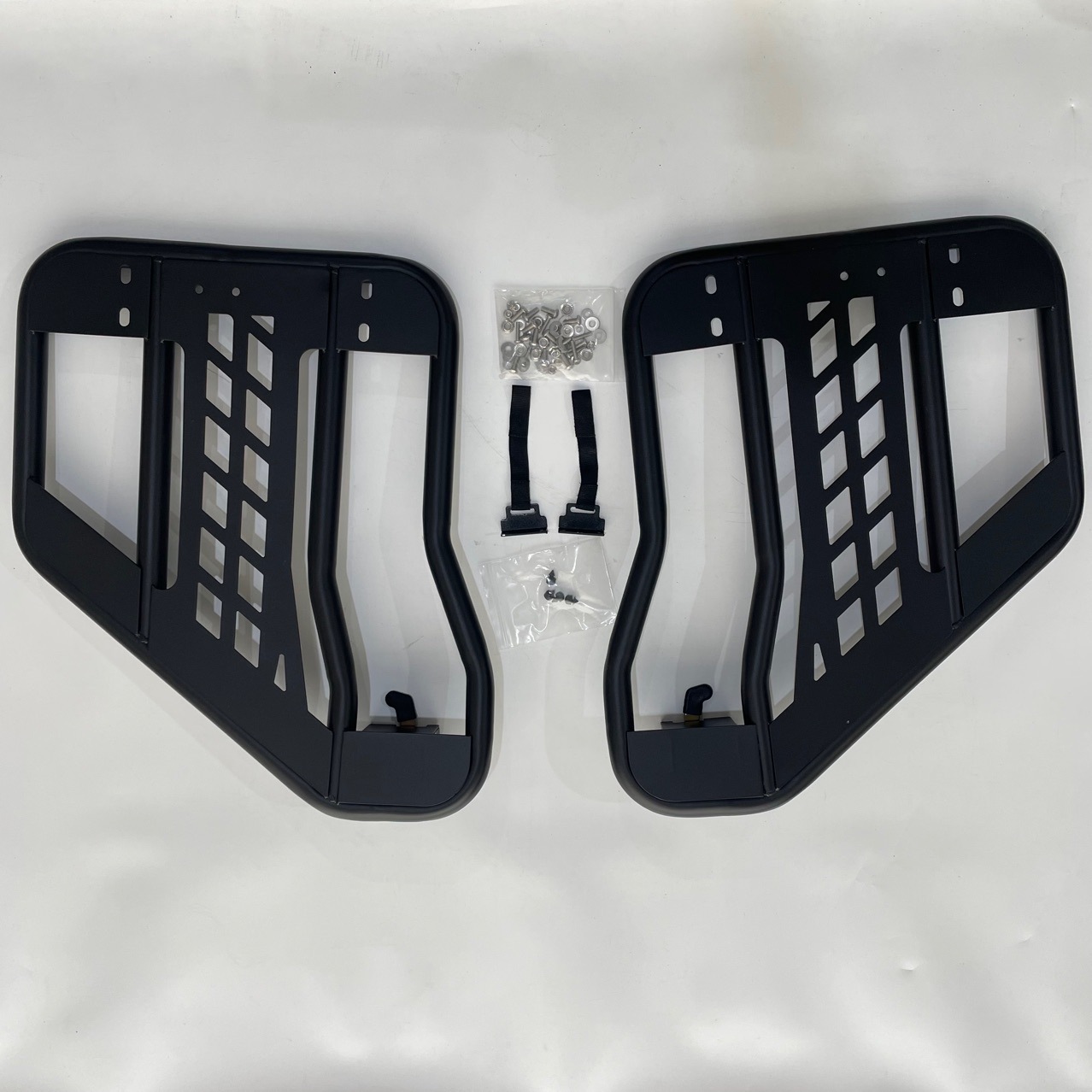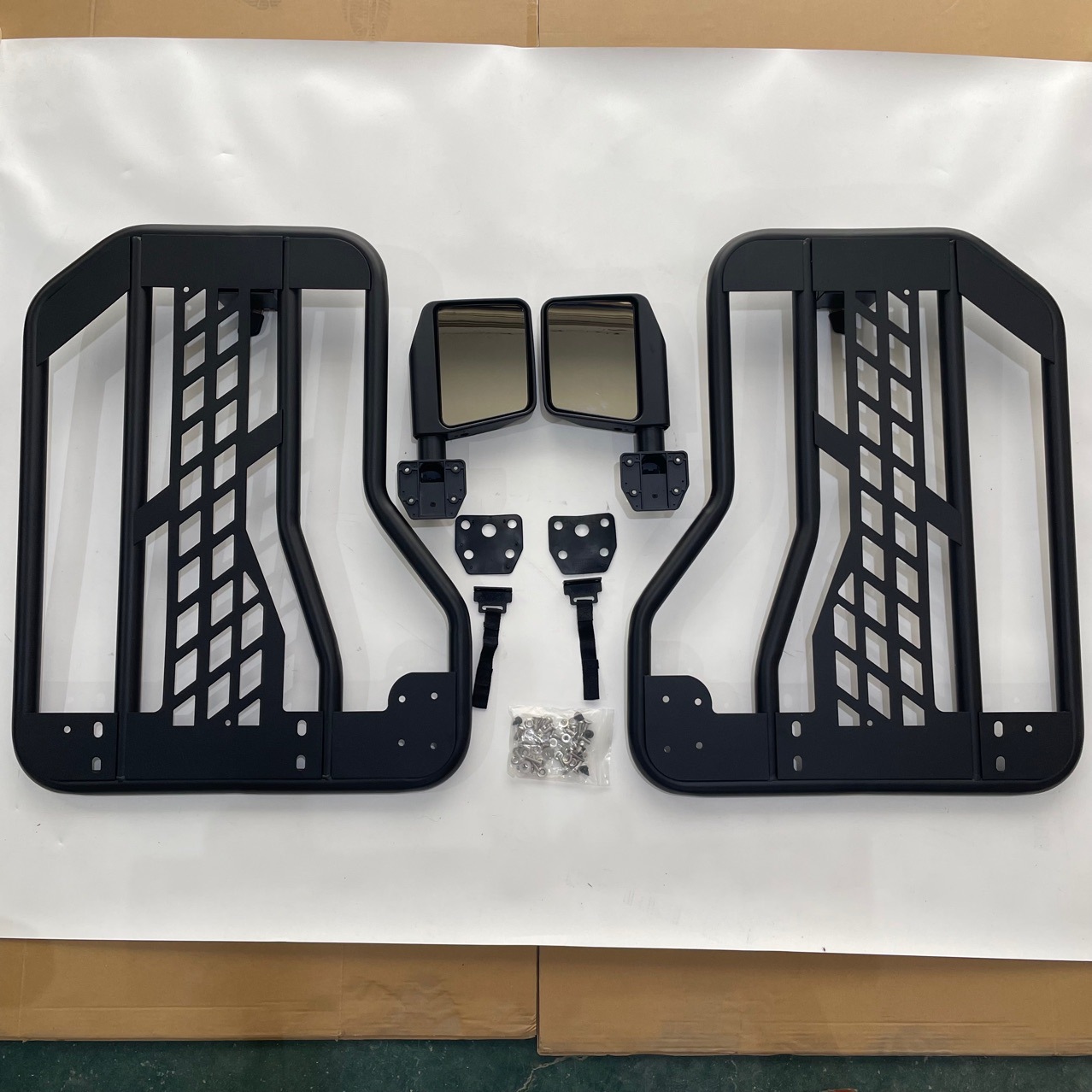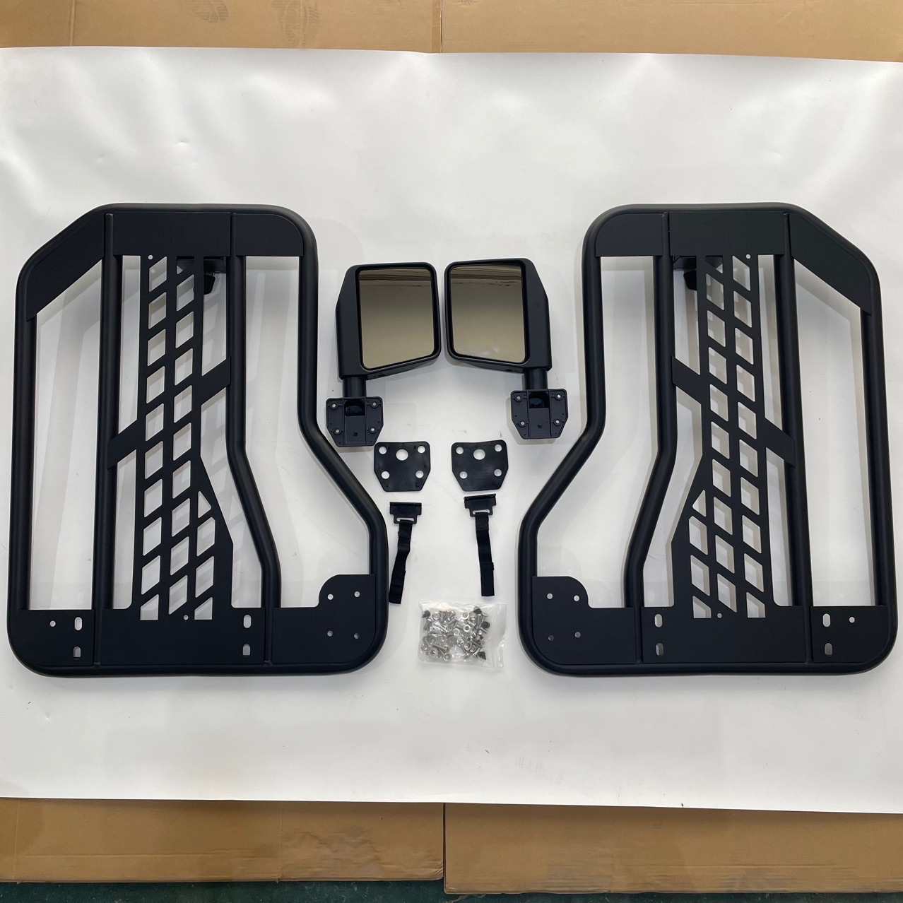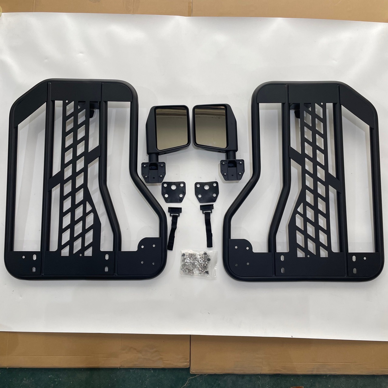 A: This set includes the rear left and right tubular doors with latches; mirrors are typically mounted on the front doors. No additional mirrors are included in this rear door kit.