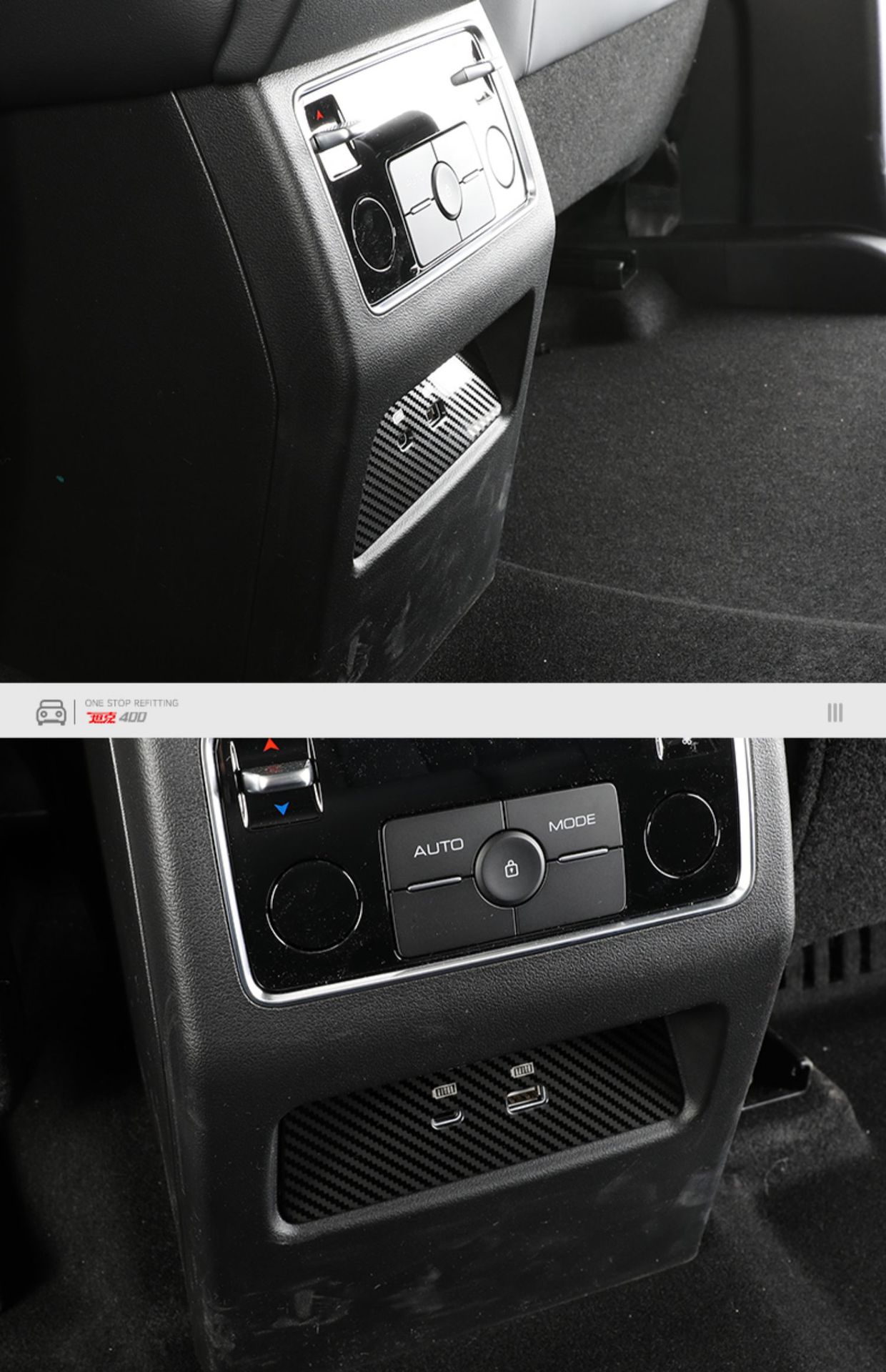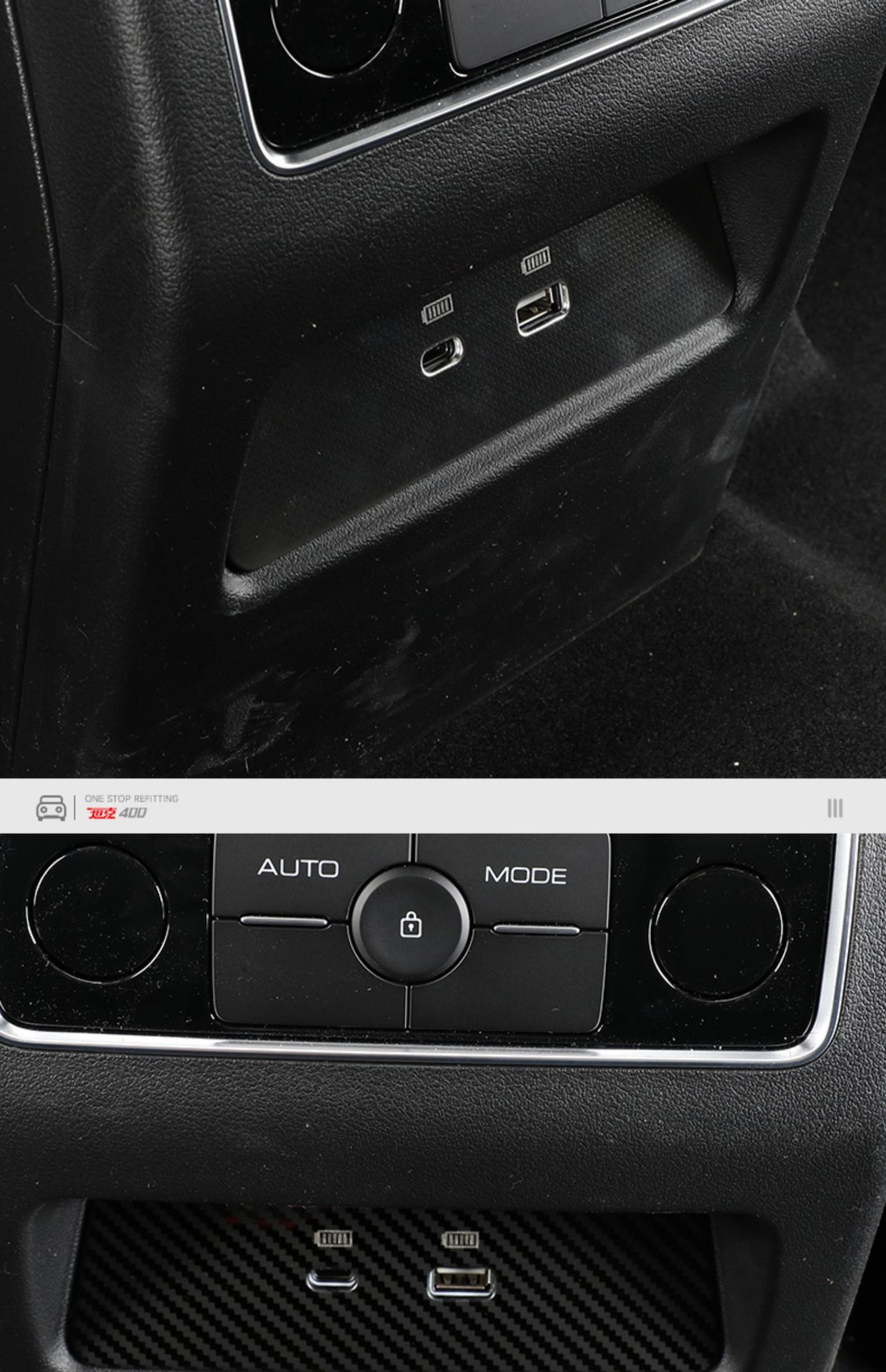 Tags: 304 stainless steel trim, car interior styling, charging port protector, interior accessories, metal port guard, Rear USB cover, second row panel decal