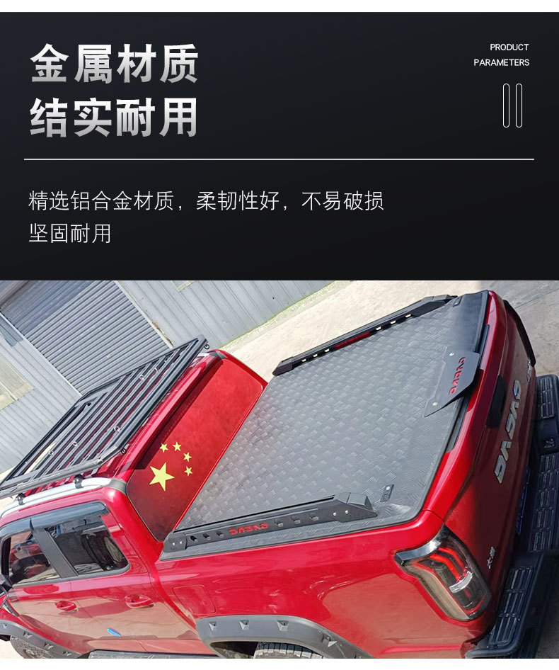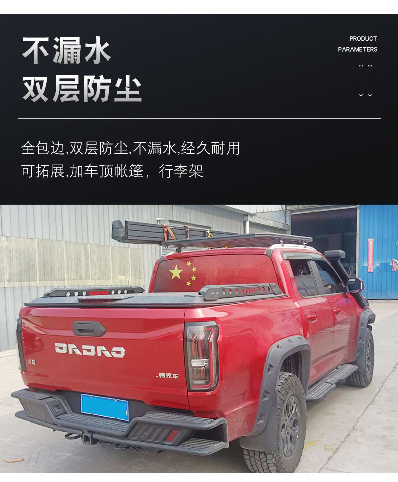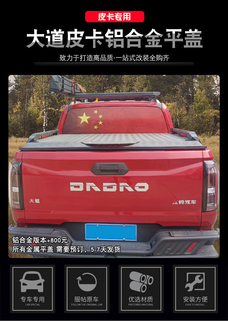 Upgrade your JMC Dadao pickup with this heavy-duty aluminum and manganese steel flat tonneau cover. Provides secure cargo protection and sleek exterior styling.