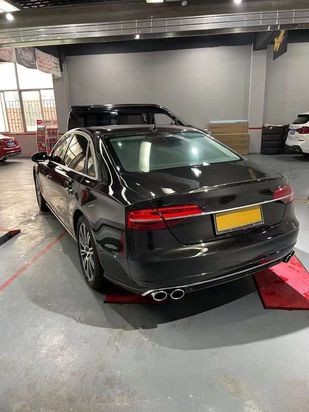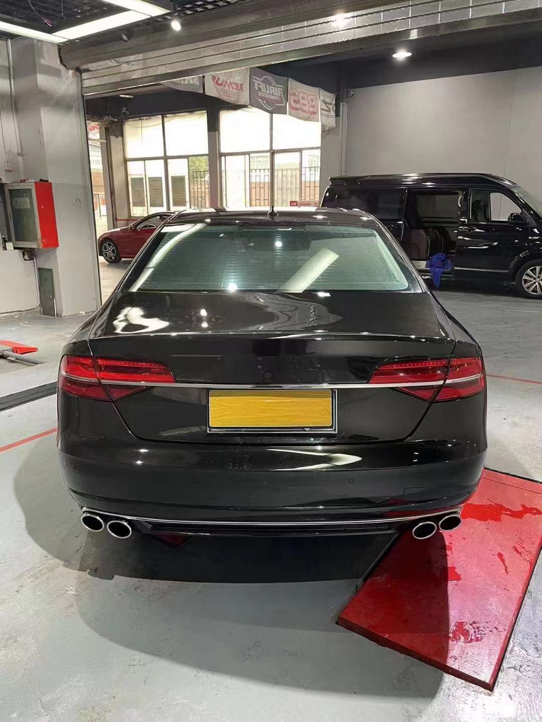 Tags: Audi A8 D4 modification, automotive exterior styling, car rear lip spoiler, exhaust muffler tips, quad exhaust valance, rear bumper diffuser, S8 style body kit