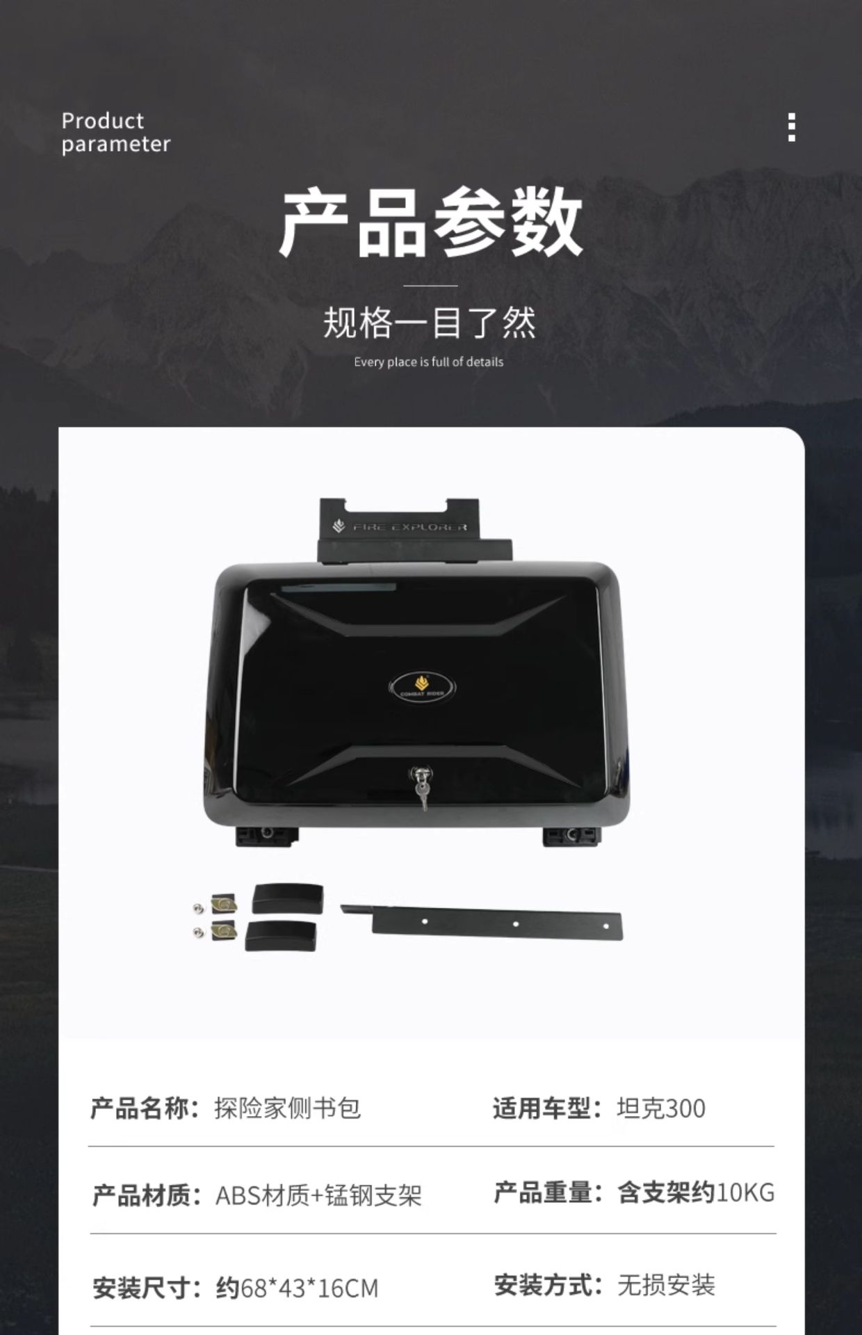 Upgrade your Tank 300 with this durable side-mounted cargo storage box. Perfect for off-road tools and gear, offering secure and weather-resistant storage.