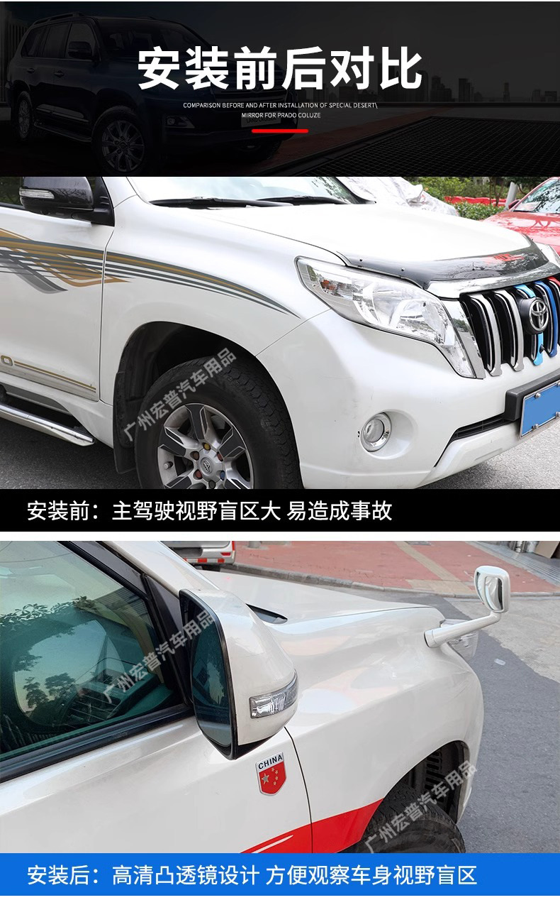 Upgrade your SUV safety with this premium fender blind spot mirror. Designed for Land Cruiser and Prado, it offers a wide-angle view to eliminate driving risks.