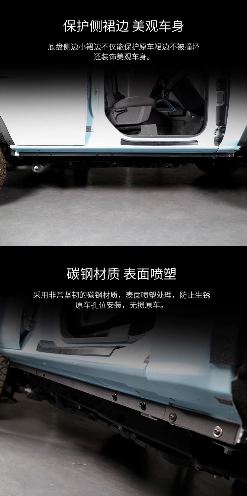 Protect your Ford Bronco with these heavy-duty side rocker panel guards and door anti-collision strips. Durable exterior protection against scratches and impacts.