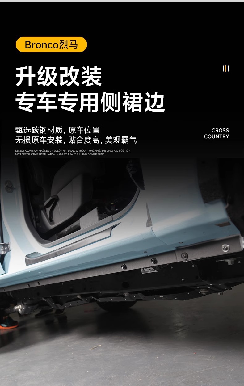- Custom fit side rocker panel guards designed specifically for Ford Bronco exterior body protection.
