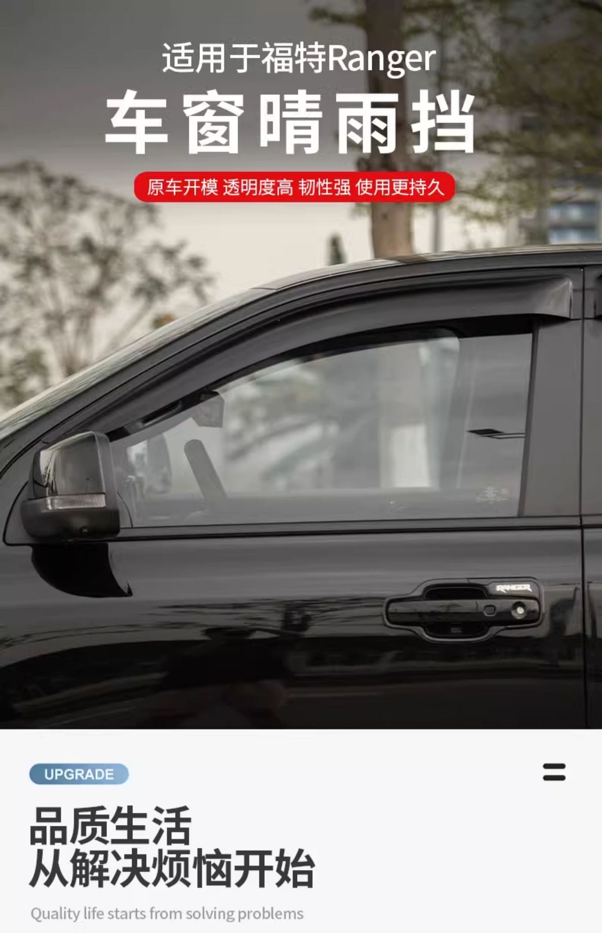 Upgrade your Ford Ranger with these durable side window deflectors. Protect your cabin from rain and wind while reducing noise and sunlight glare effectively.