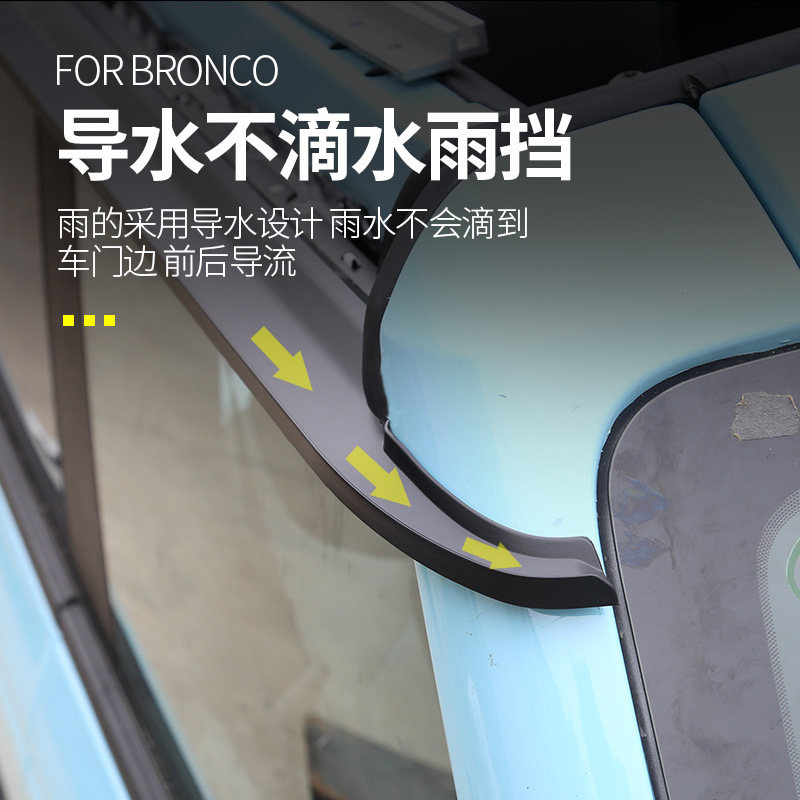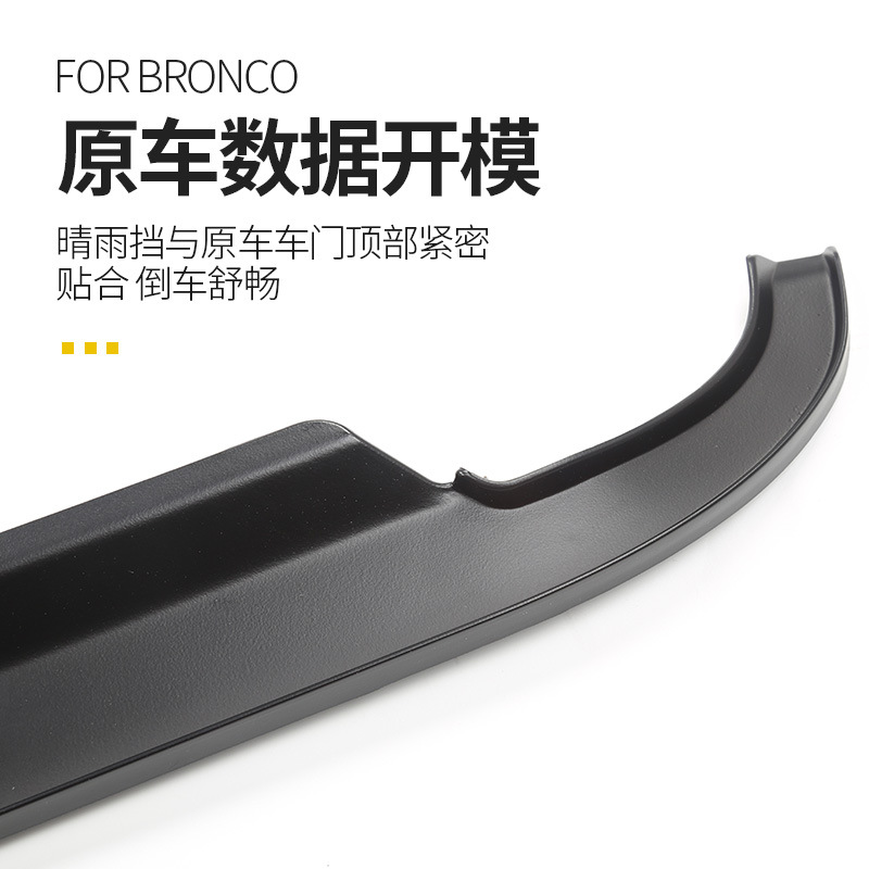 Upgrade your Ford Bronco with durable side window deflectors. Protect your interior from rain and wind while reducing noise. Easy adhesive installation.