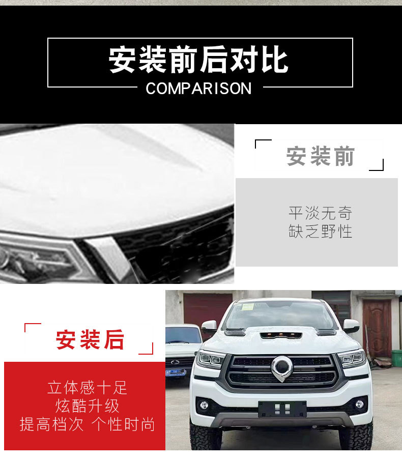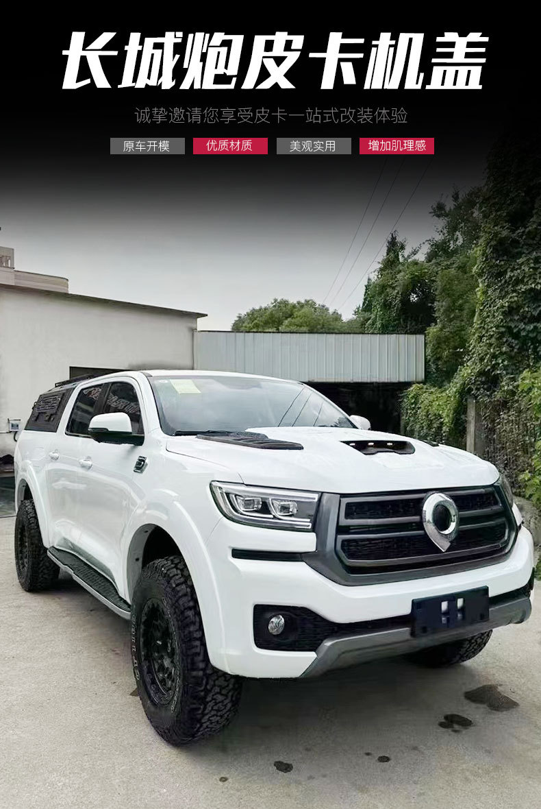 Tags: automotive body parts, car front cover, Great Wall Cannon bonnet, GWM Poer engine hood, off-road exterior accessories, pickup truck modification, T-Rex style hood
