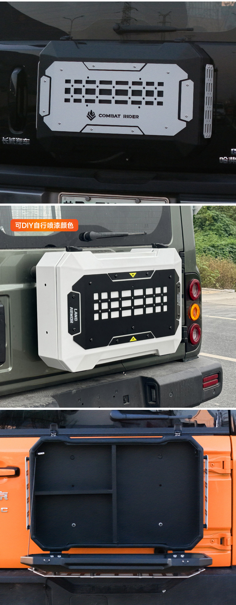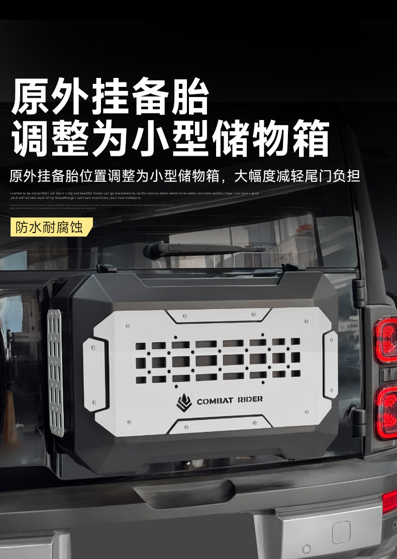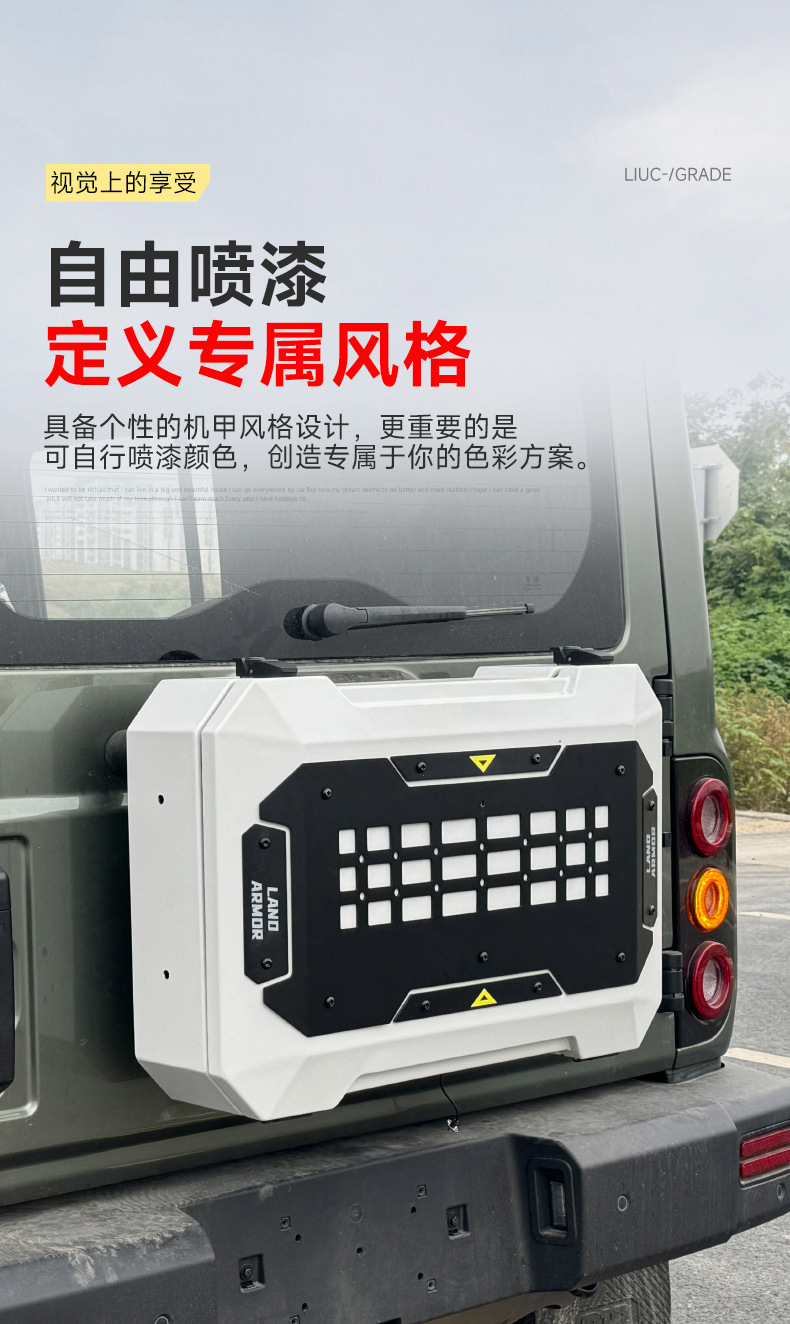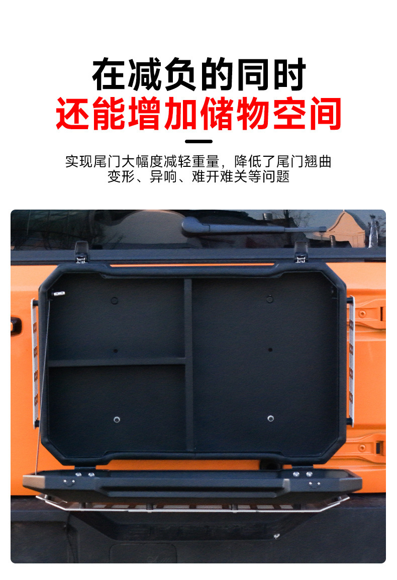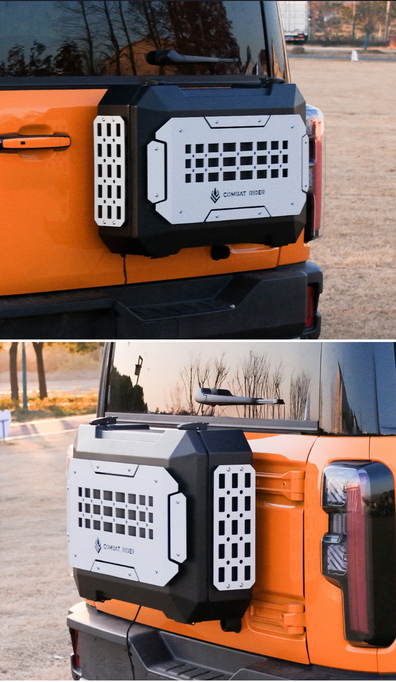 Tags: off-road gear rack, rear door side panel, spare tire storage, tailgate storage box, tool carrier rack, trunk organizer tray, vehicle exterior organizer