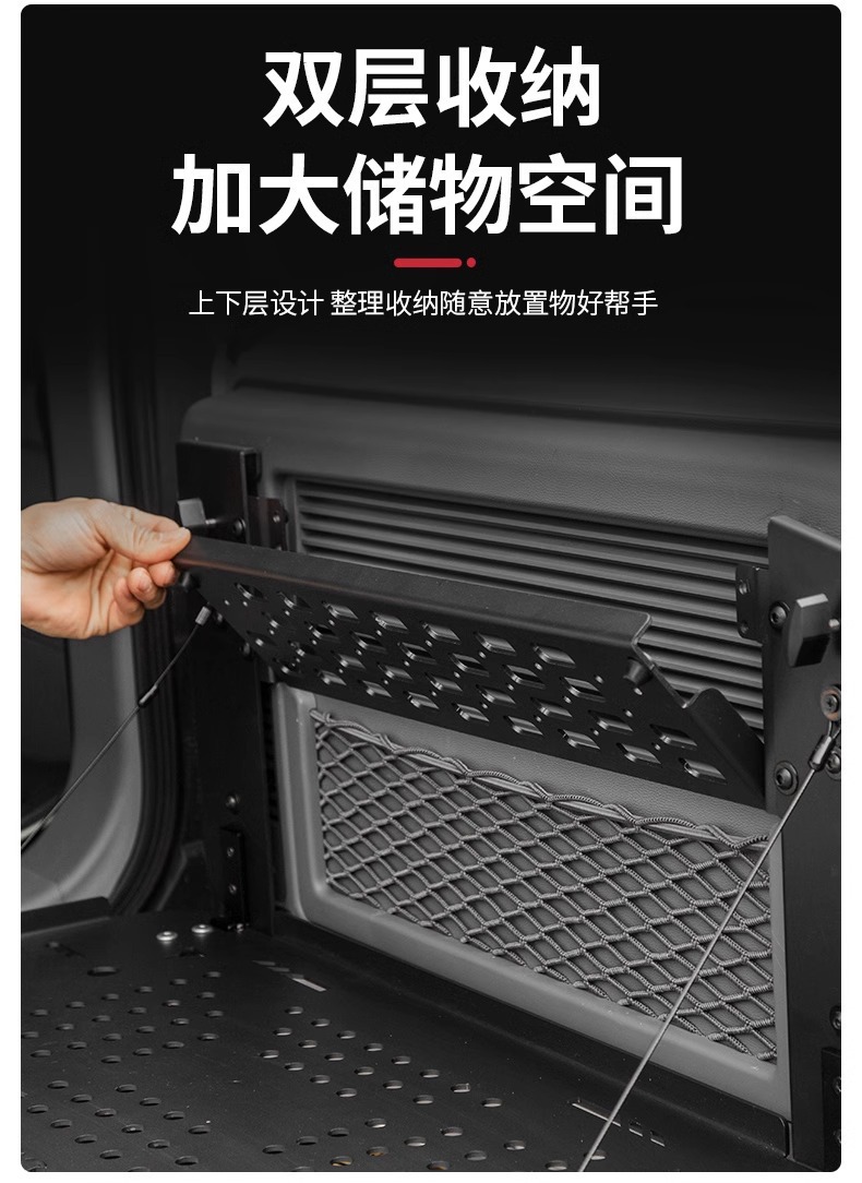 - Multi-functional shelf expands trunk storage capacity for organizing tools, gear, and cooking supplies.