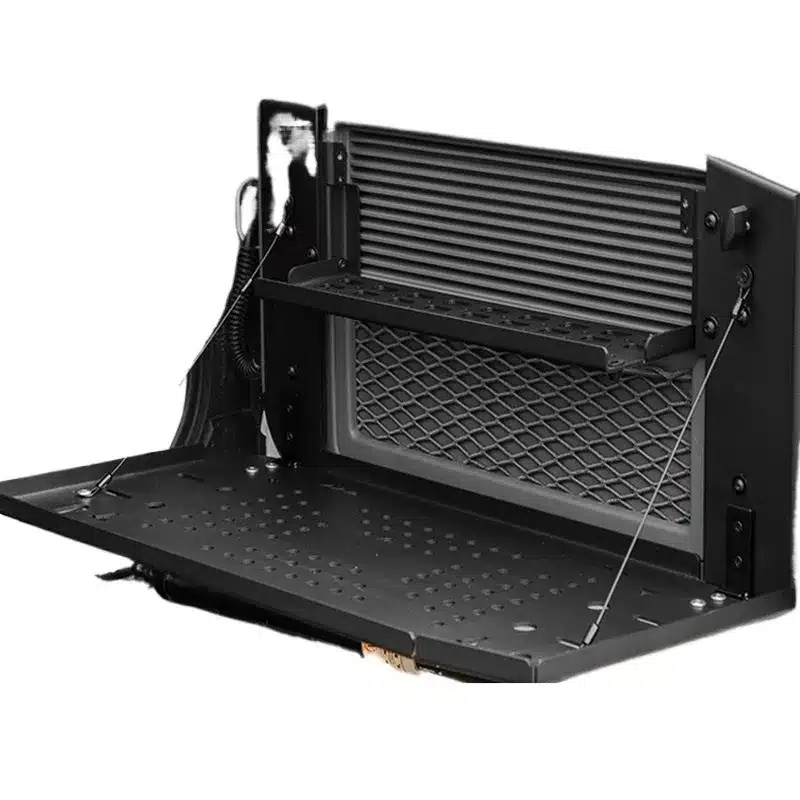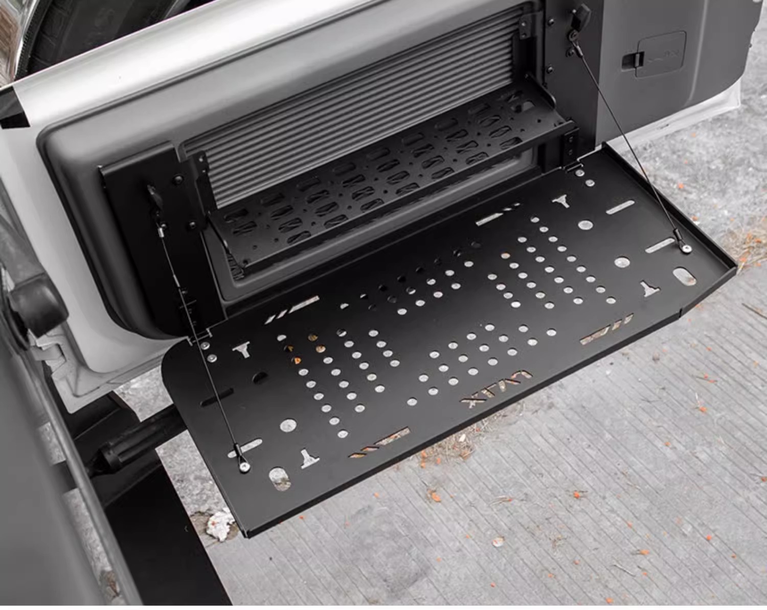 Enhance your BJ40 with this foldable tailgate storage rack. Perfect for camping and outdoor trips, this durable steel shelf provides extra space and a work table.