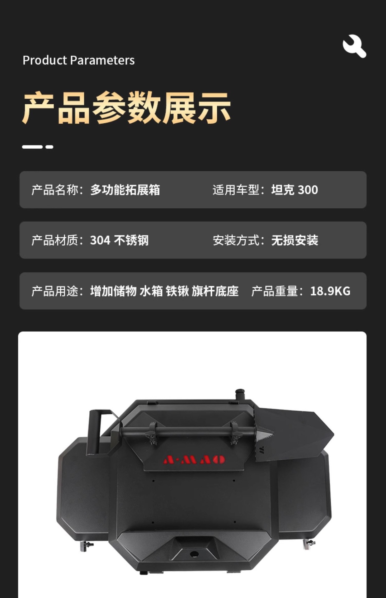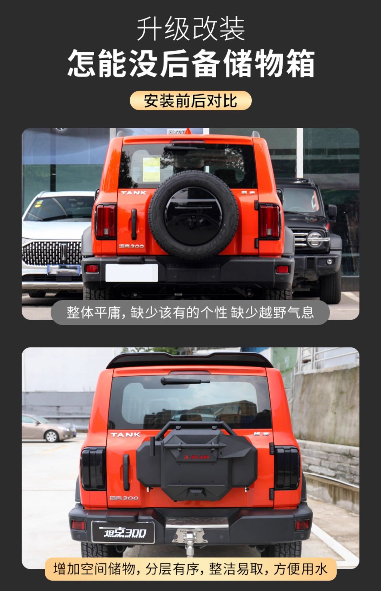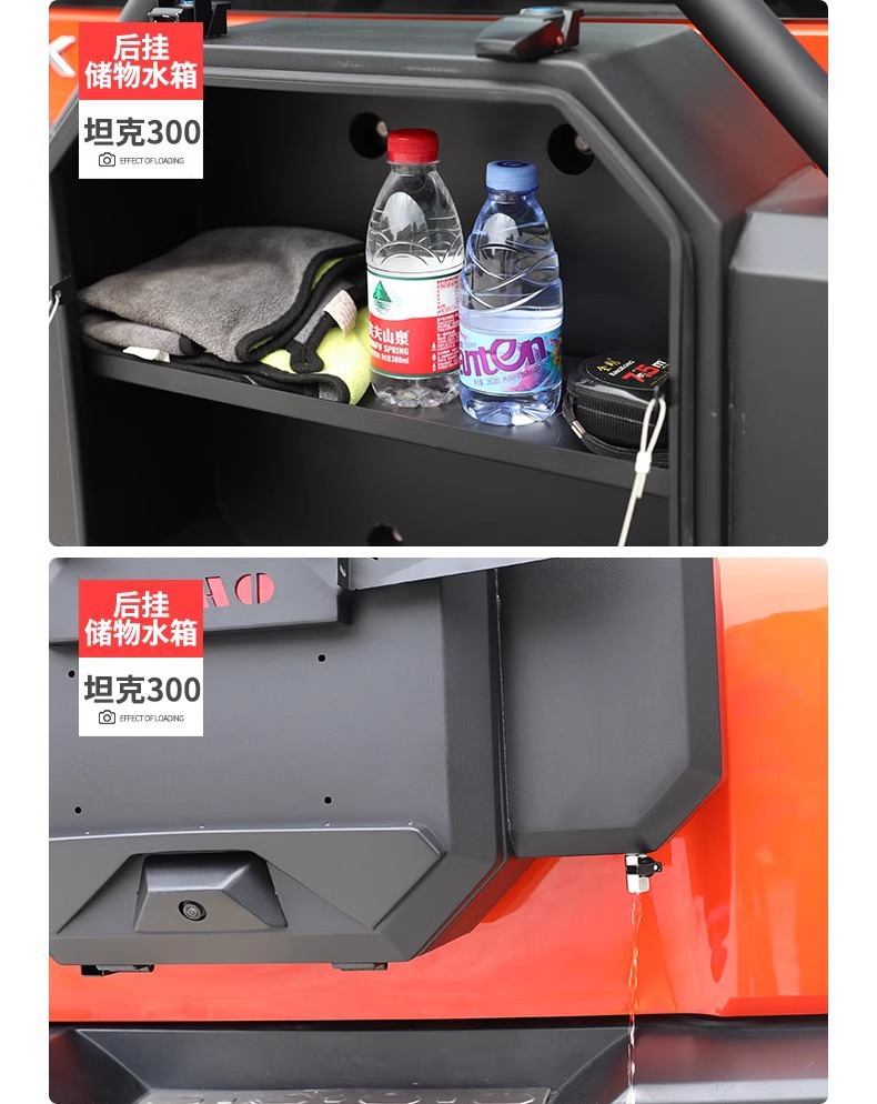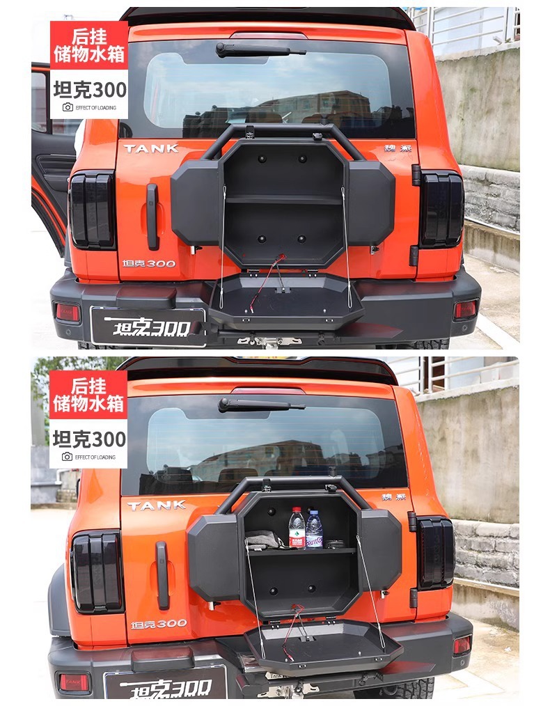 Enhance your Tank 300 with this multifunctional tailgate tool box featuring a stainless steel water tank. Durable construction ensures secure off-road storage solutions.