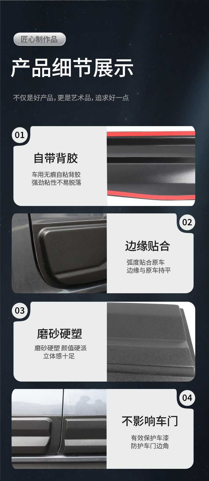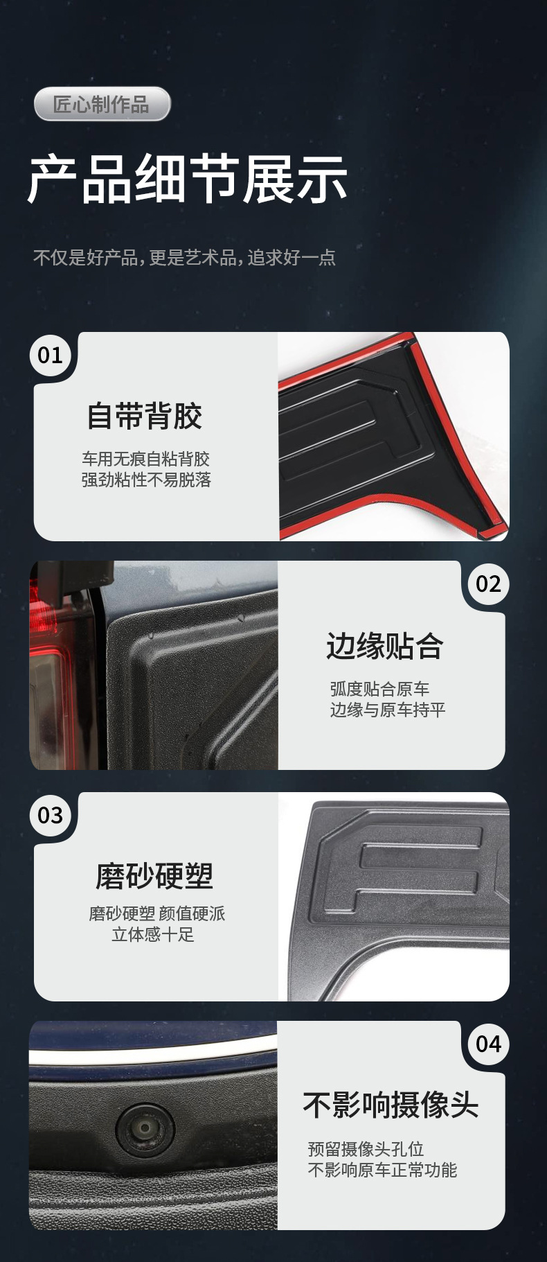 - Easy installation with automotive-grade double-sided adhesive tape requiring no drilling or modifications.