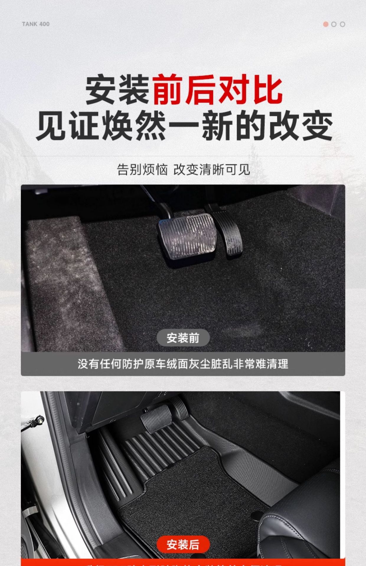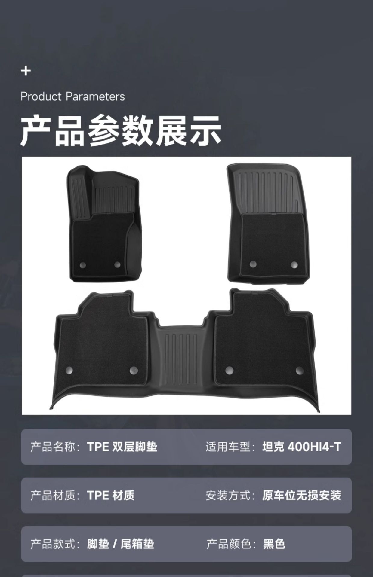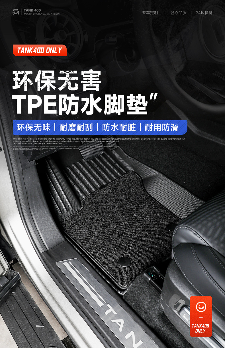 Upgrade your Tank 400 Hi4-T with these premium TPE all-weather floor mats. Waterproof, durable, and custom-fit for ultimate interior protection and cleanliness.