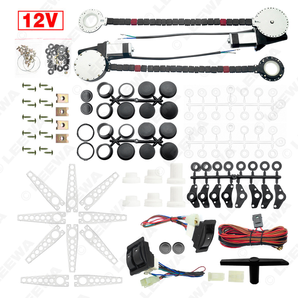 Upgrade your manual windows with this universal 2-door 12V electric power window kit. Includes 3 switches and wiring for smooth, reliable glass lifting control.