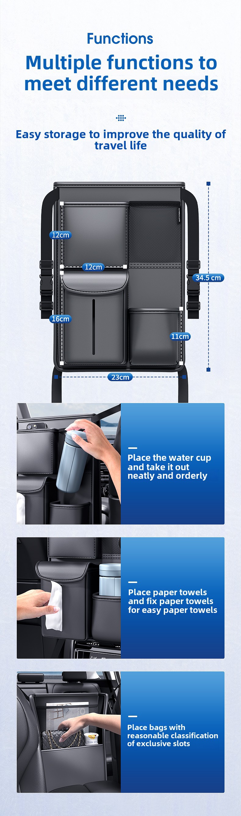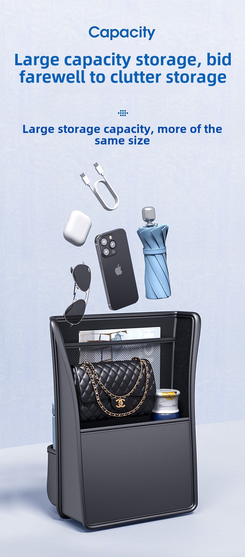 - Universal fitment design compatible with sedans, SUVs, and trucks, serving as both a storage bag and a seat protector.