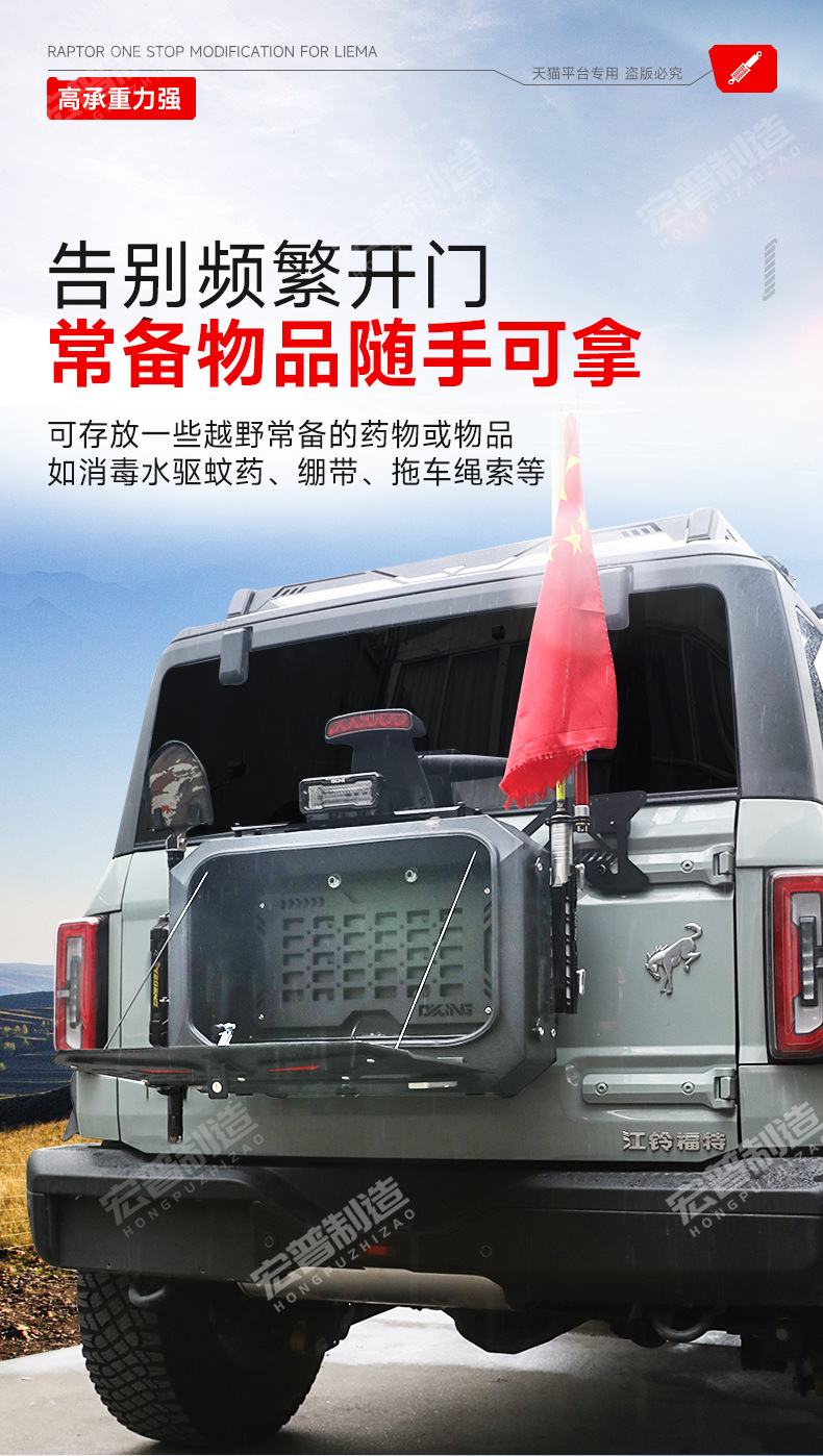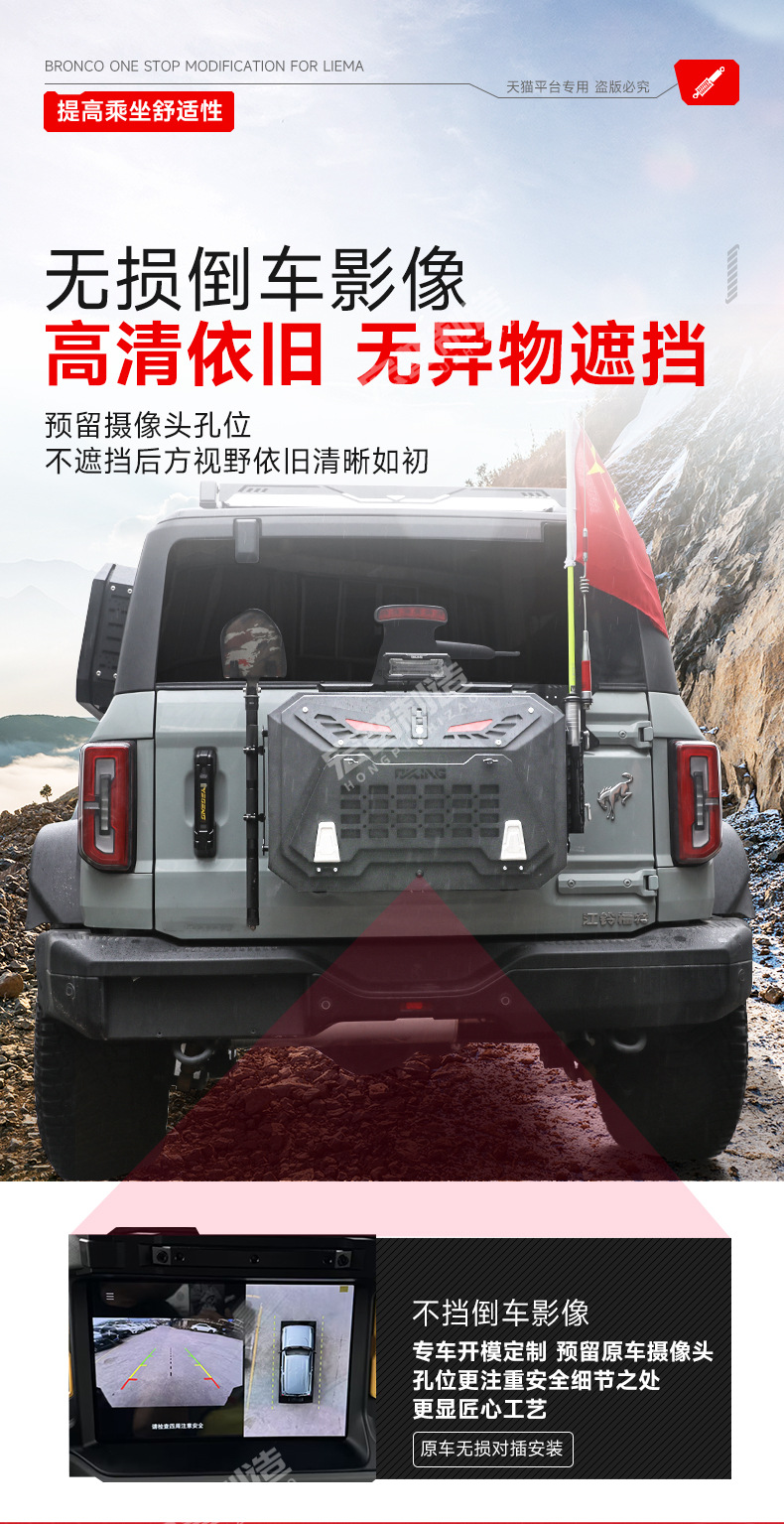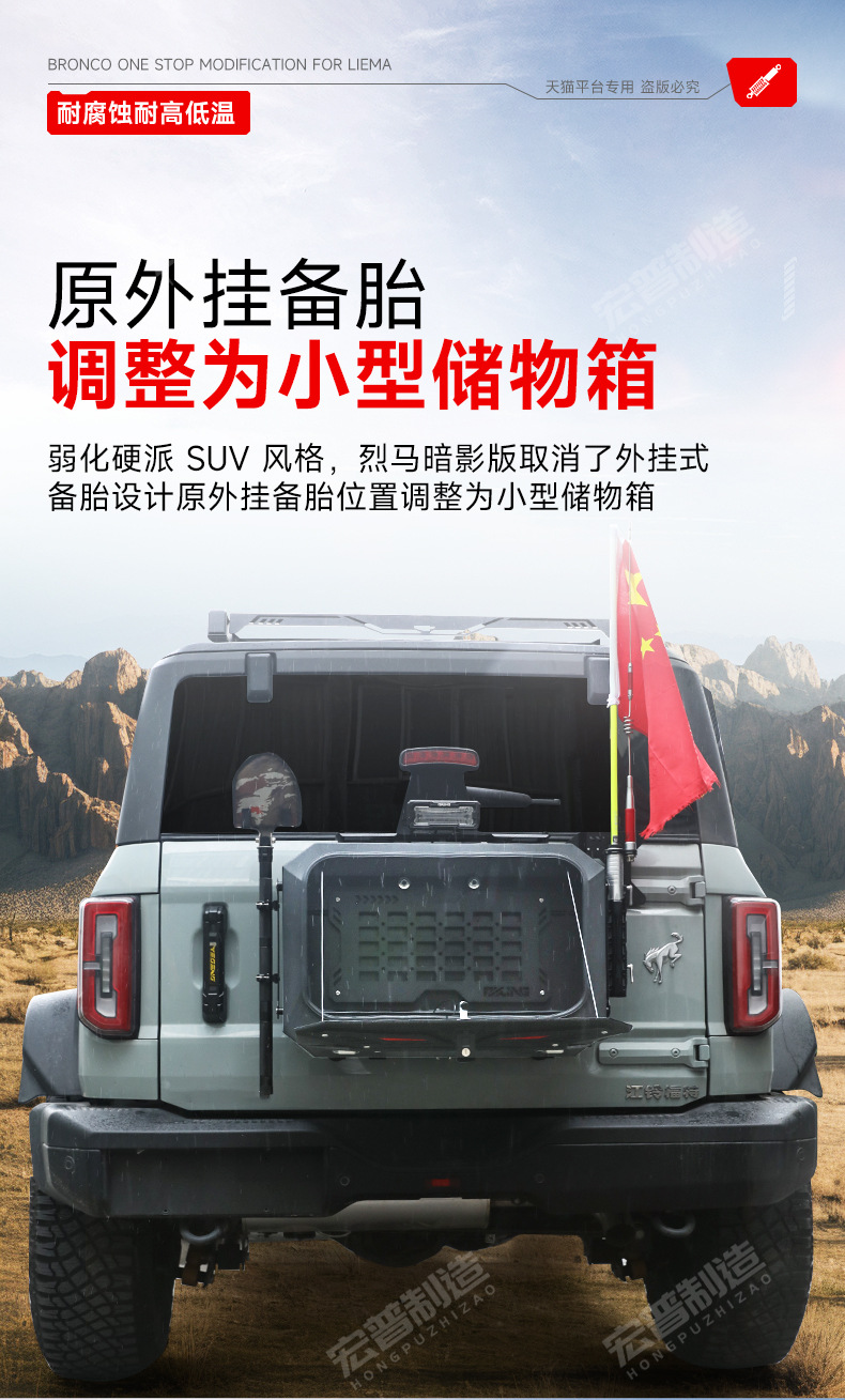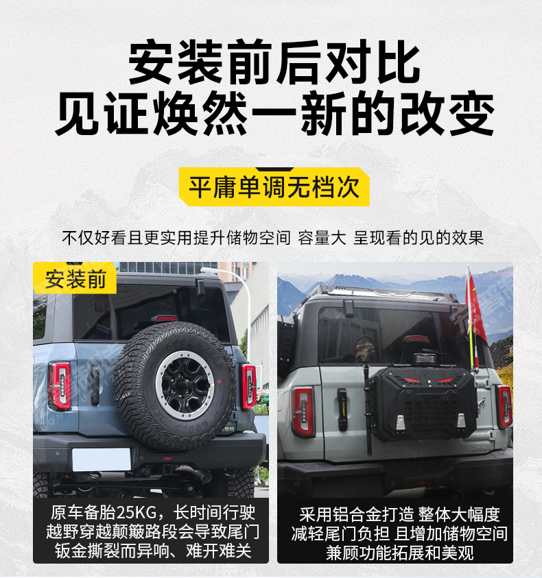 - Compatible with various cross-country models including Tank 300, Tank 500, and Bronco with spare tire mounting areas.