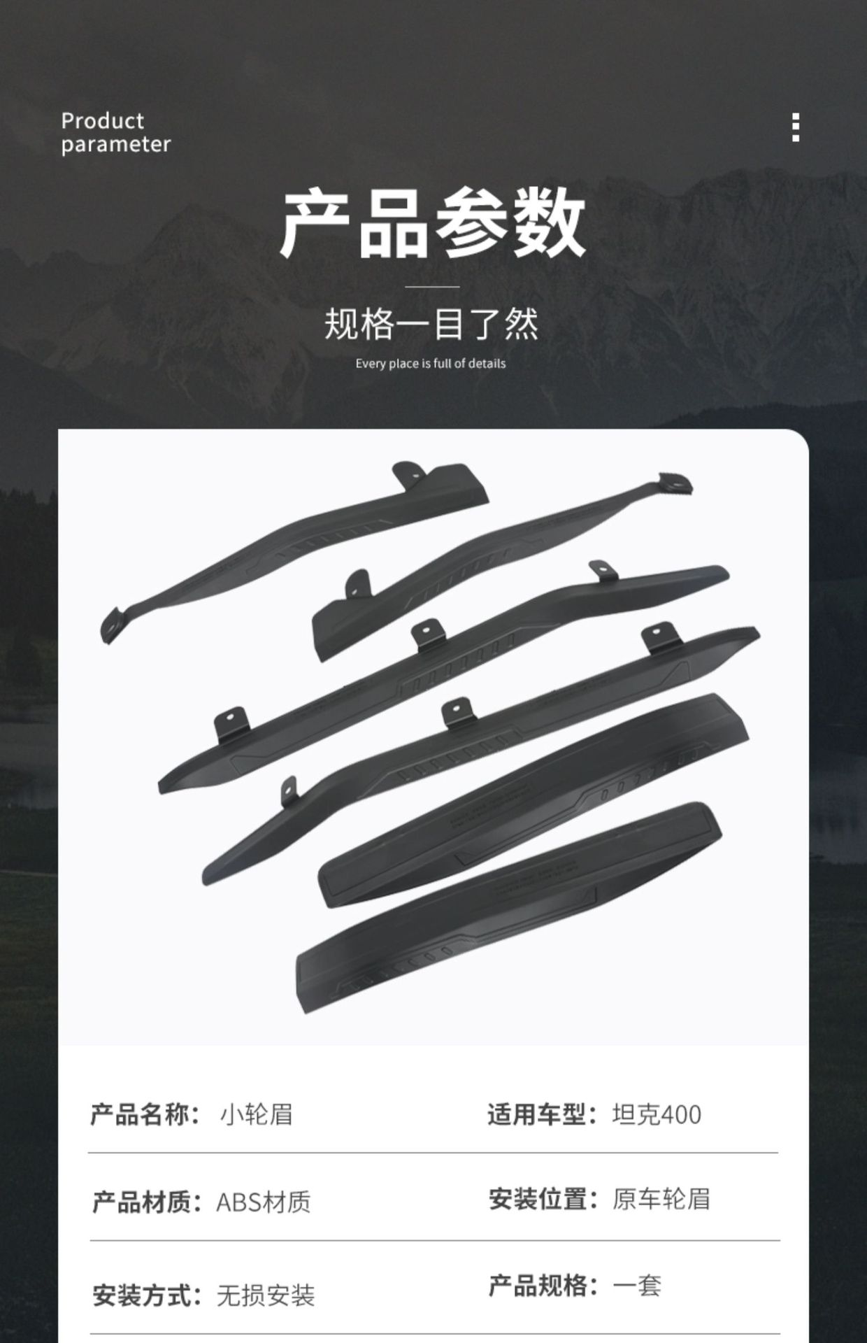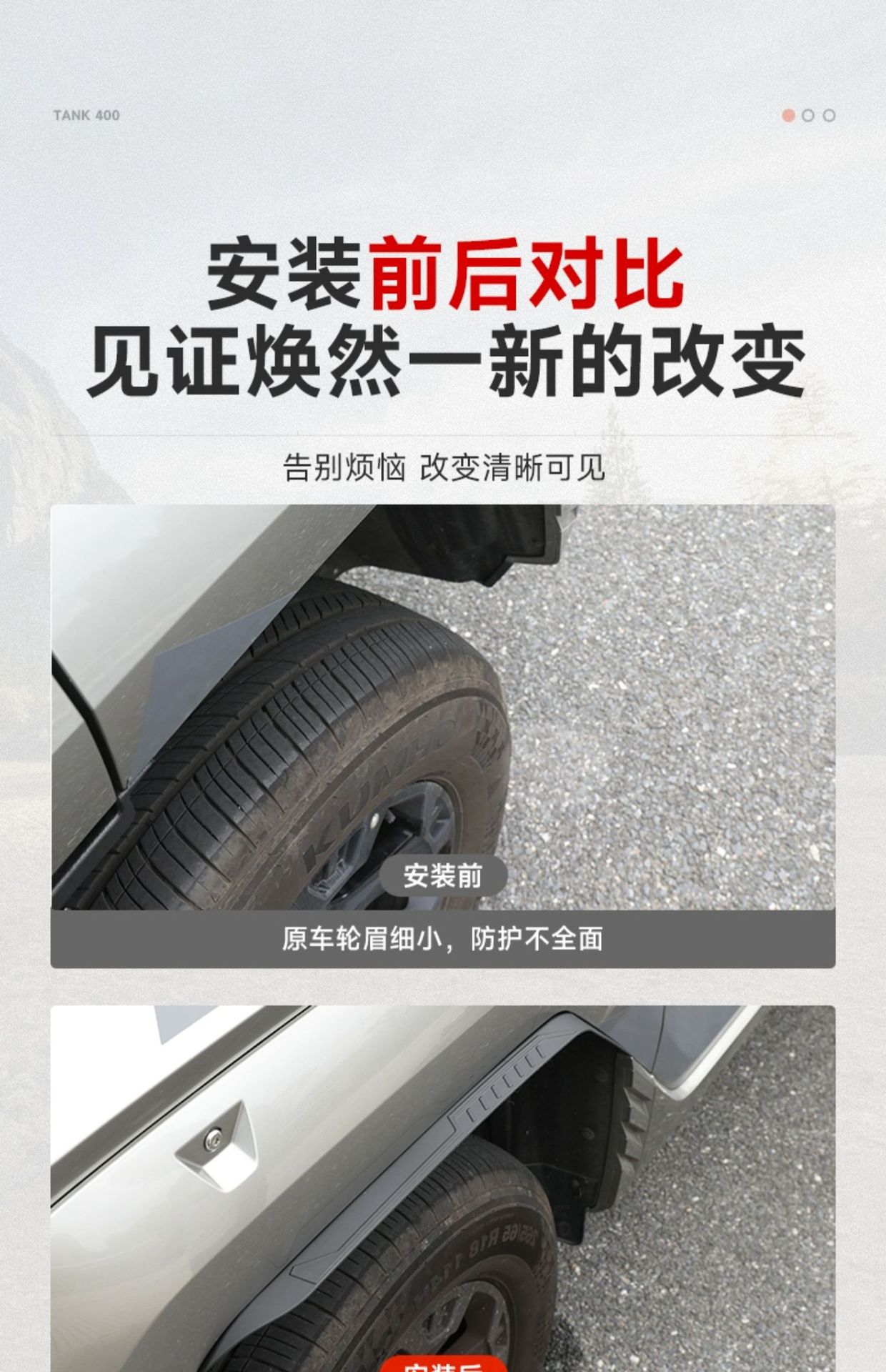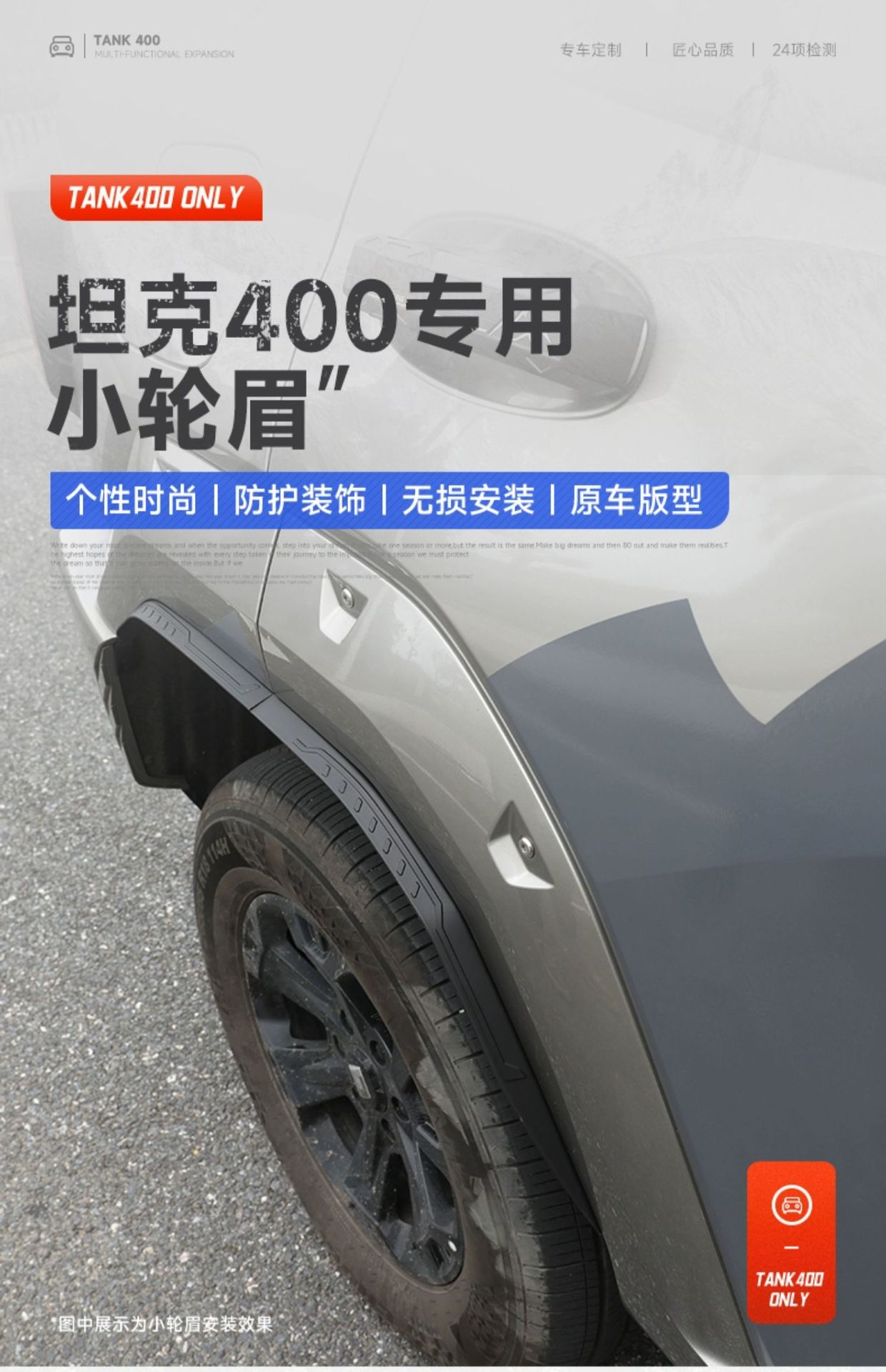 Upgrade your Tank 400 with durable ABS wheel arch flares. Enhanced off-road protection and wide-body styling for superior exterior durability and rugged looks.