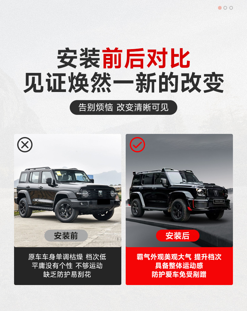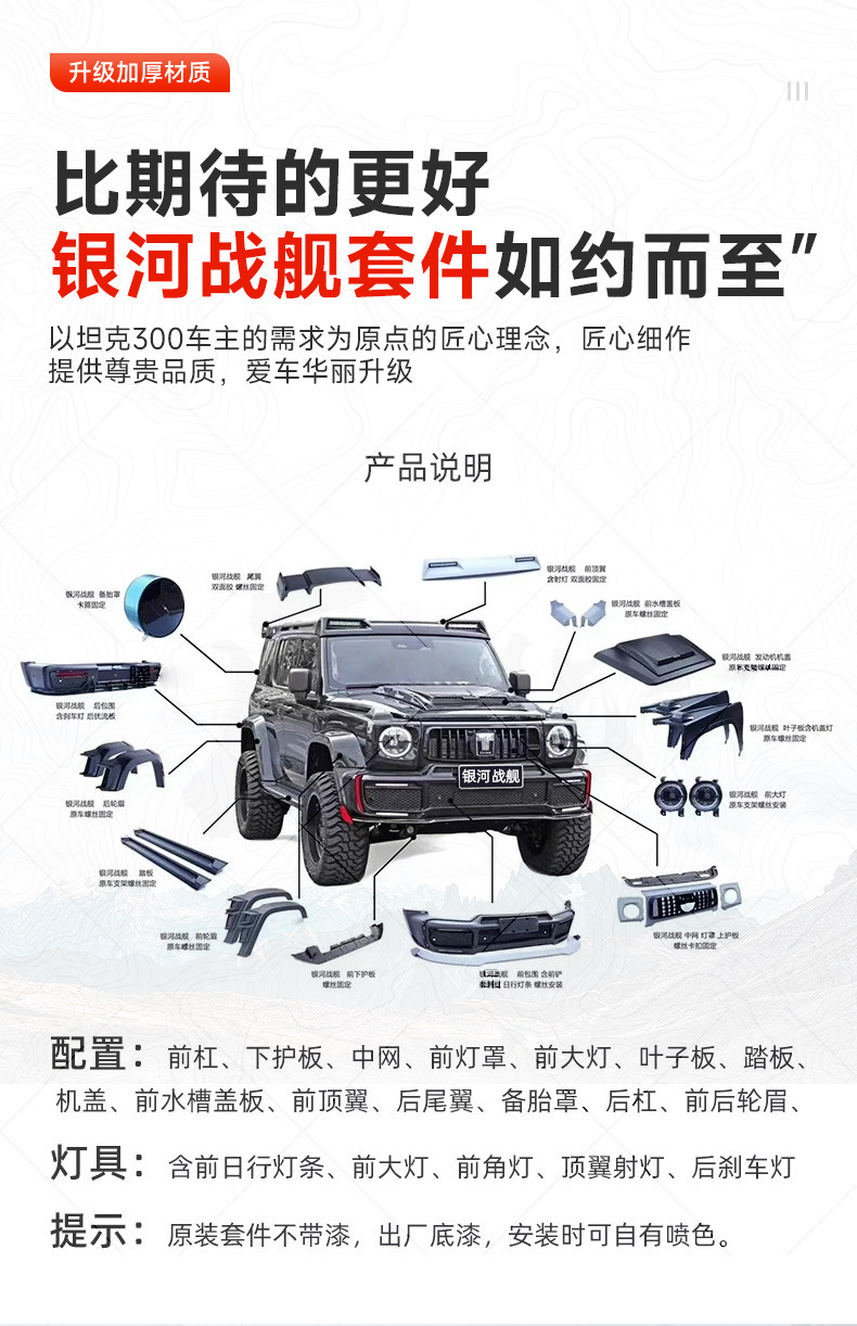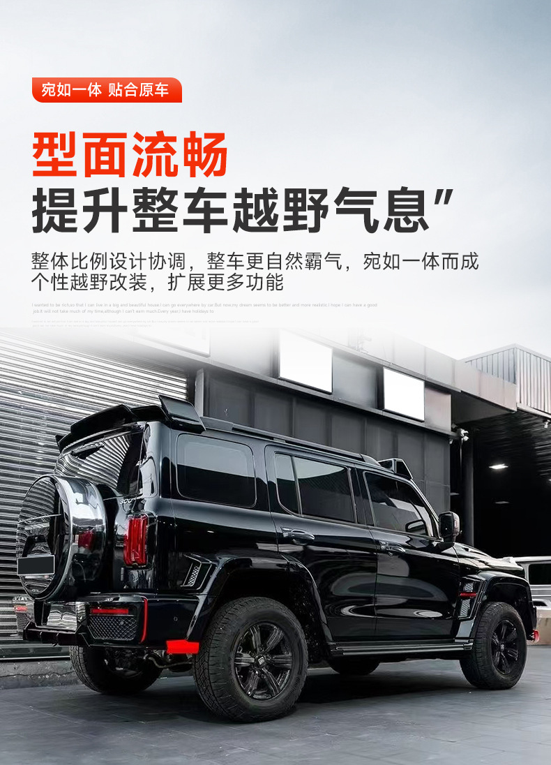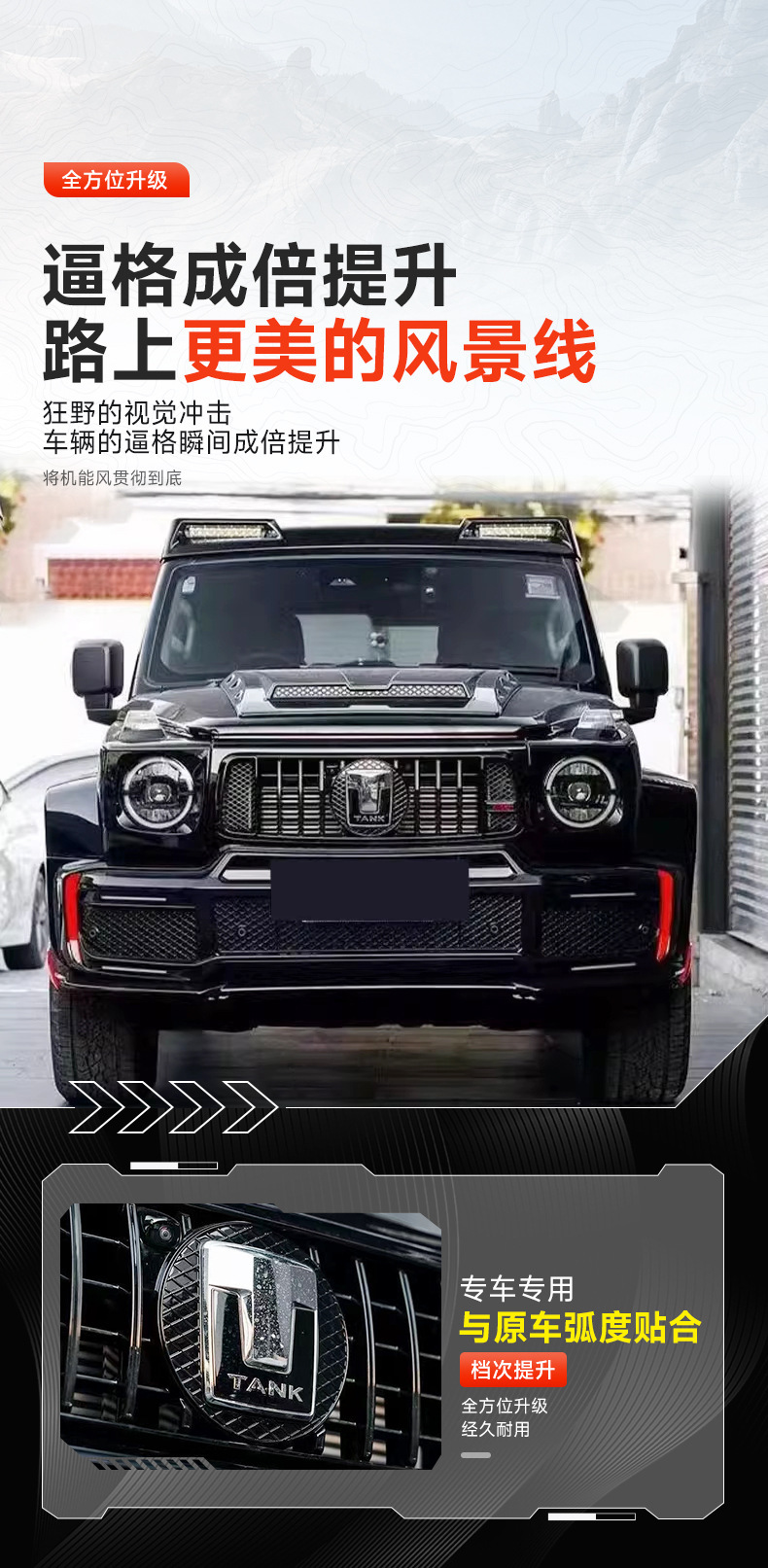 Upgrade your Tank 300 with this premium wide body kit. Featuring a front bumper, grille, and rear wing, this set enhances durability and styling for off-roading.