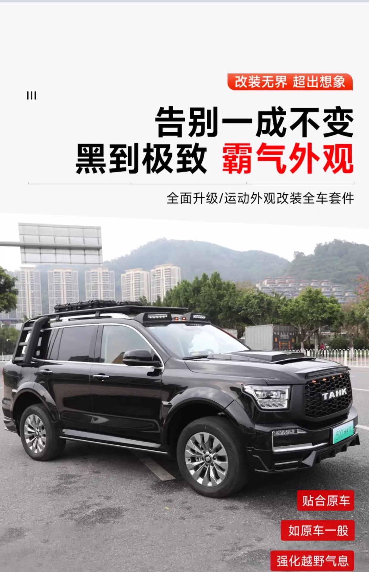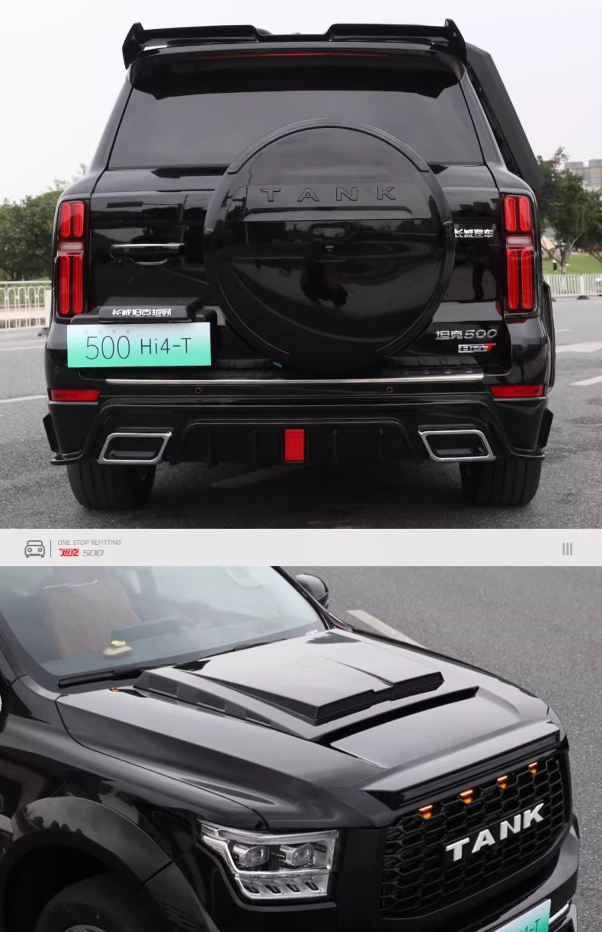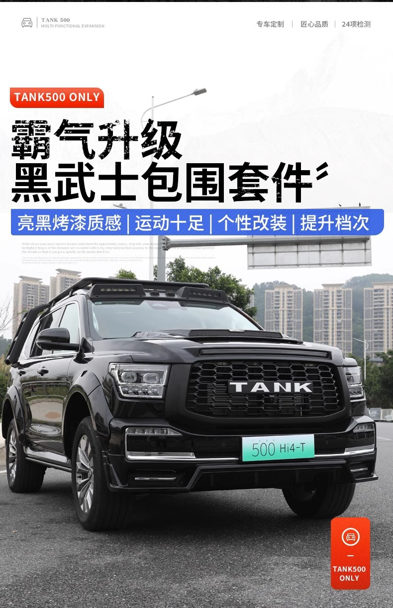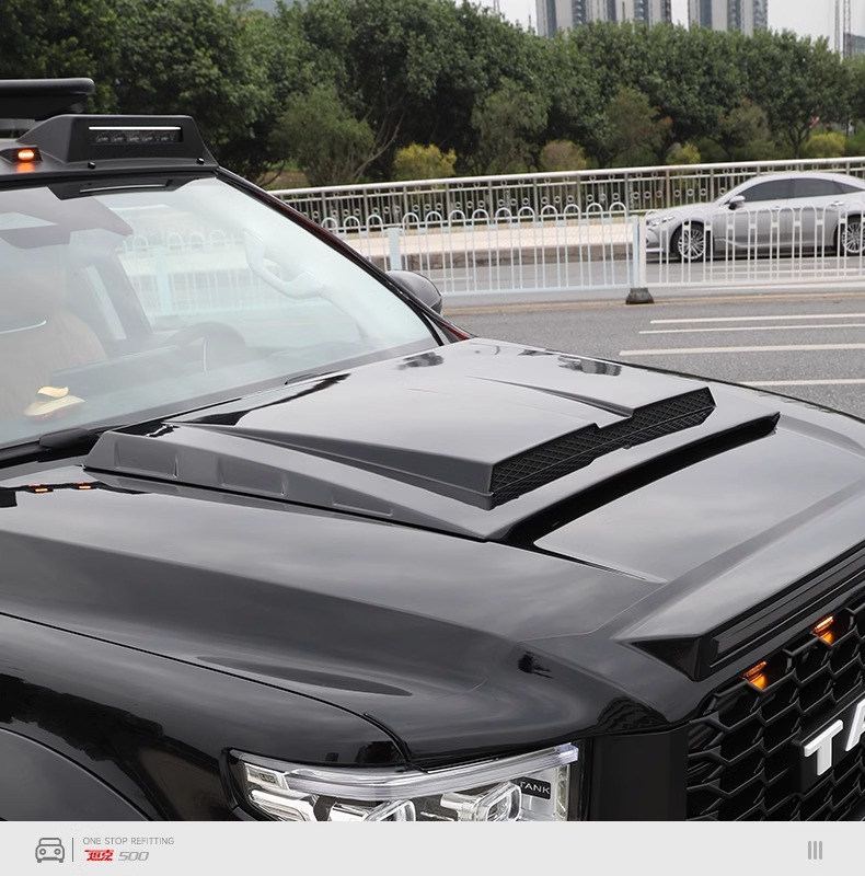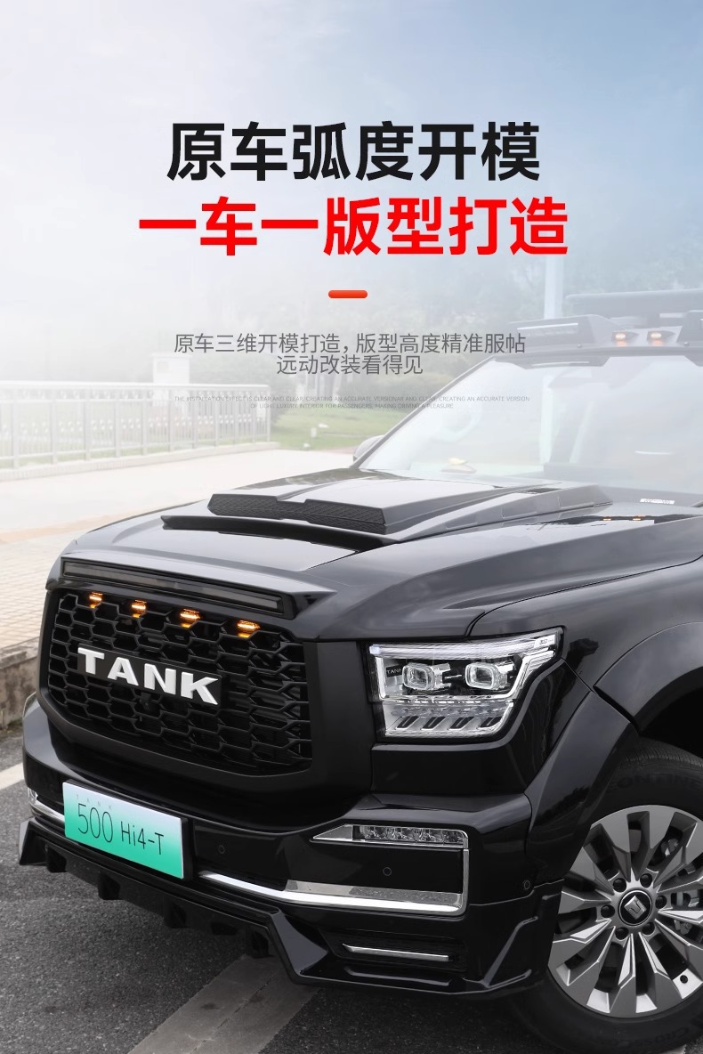 Tags: black warrior car styling, front bumper surround, hood scoop cover, off-road exterior upgrade, rear spoiler wing, Tank 500 body kit, wide body modification