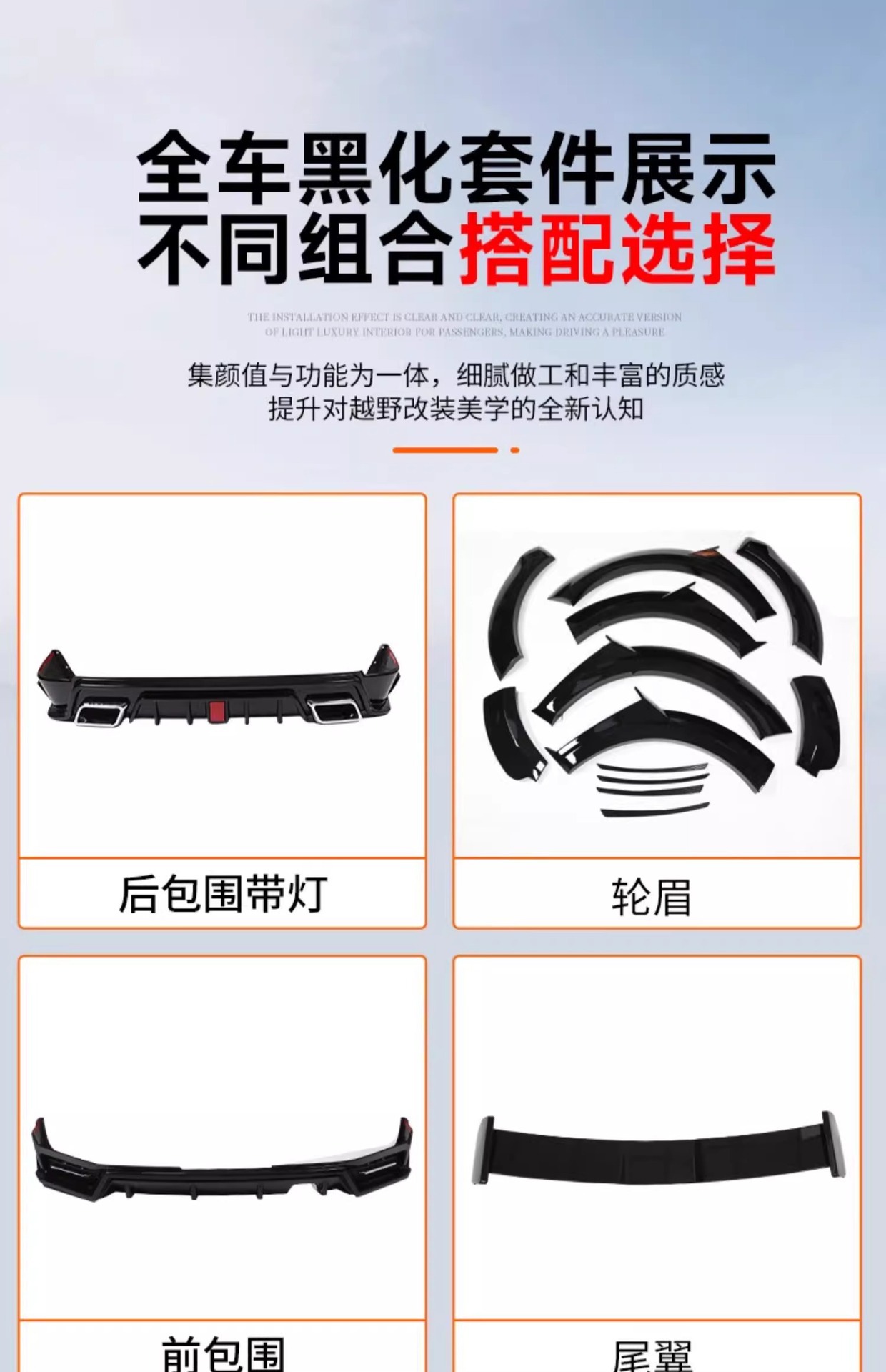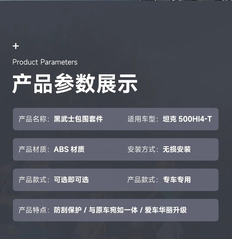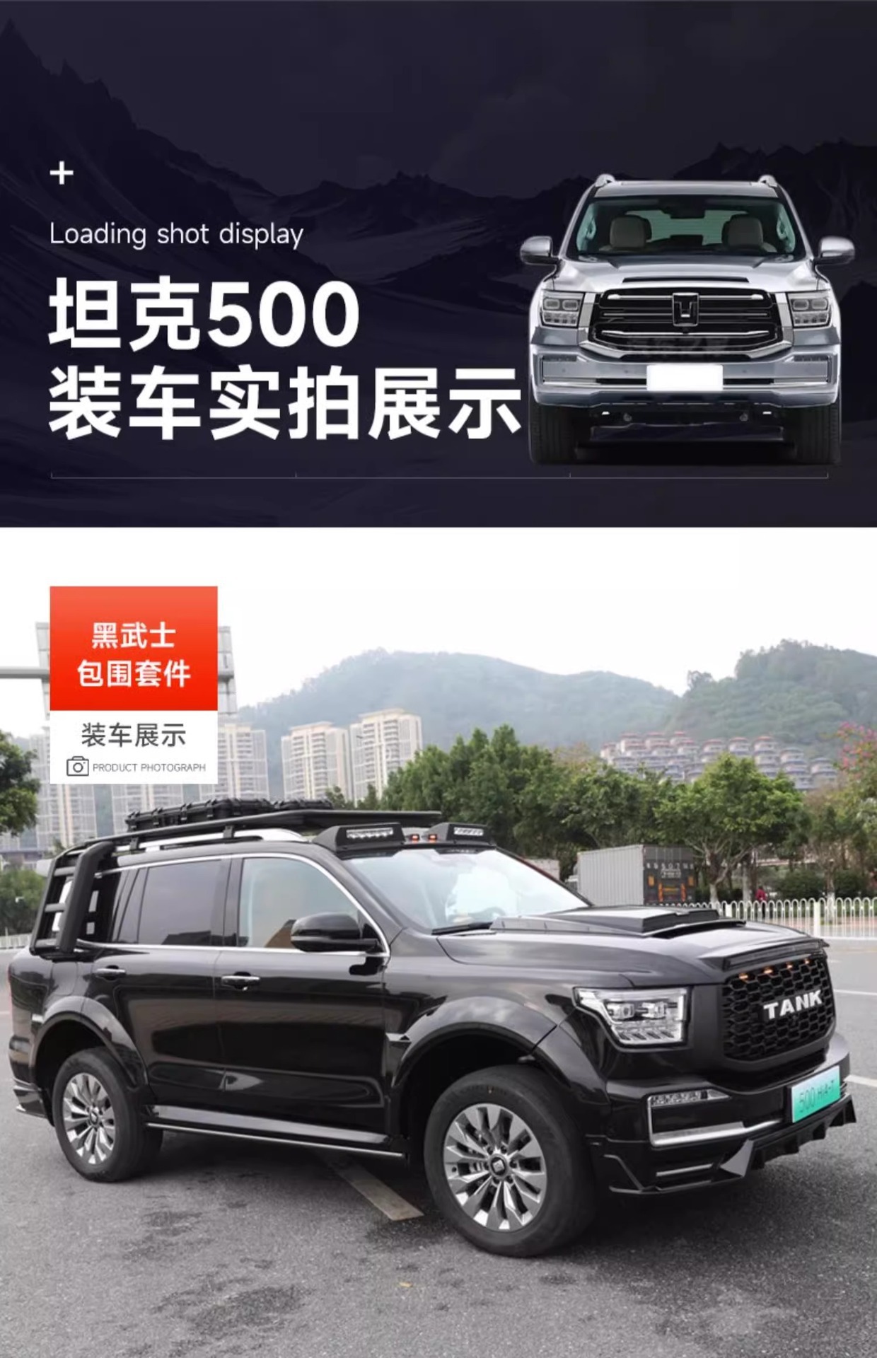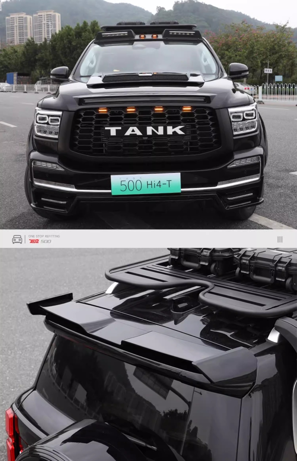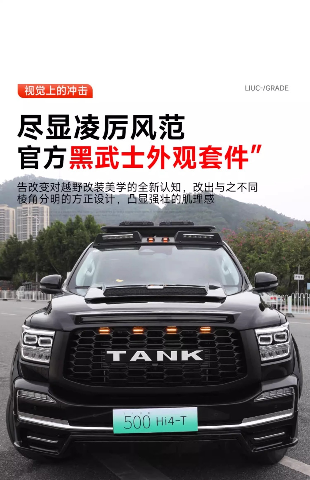 Tags: black warrior car styling, front bumper surround, hood scoop cover, off-road exterior upgrade, rear spoiler wing, Tank 500 body kit, wide body modification