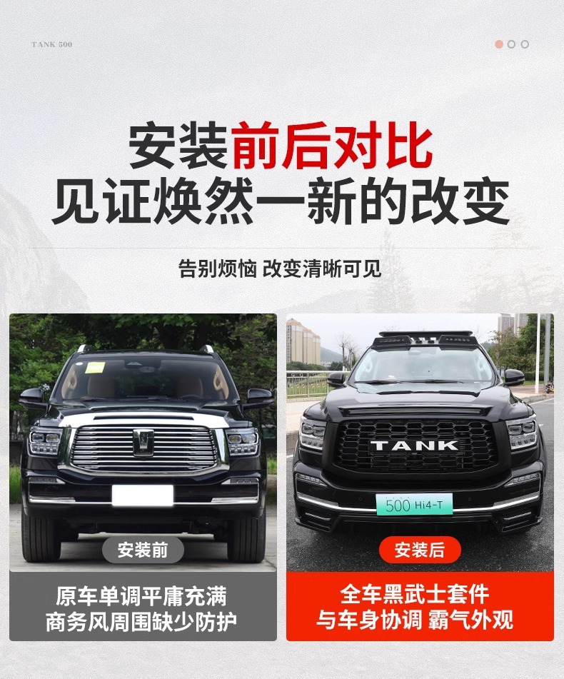 - Comprehensive exterior upgrade designed specifically for Tank 500 to achieve a rugged Black Warrior aesthetic.