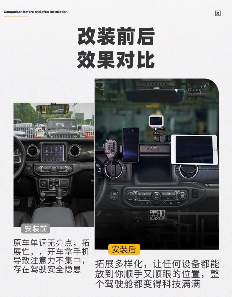 Be the first to review “Wrangler JL central control instrument panel integrated bracket modified guide rail multi-function walkie-talkie mobile phone rack interior accessories” Cancel reply