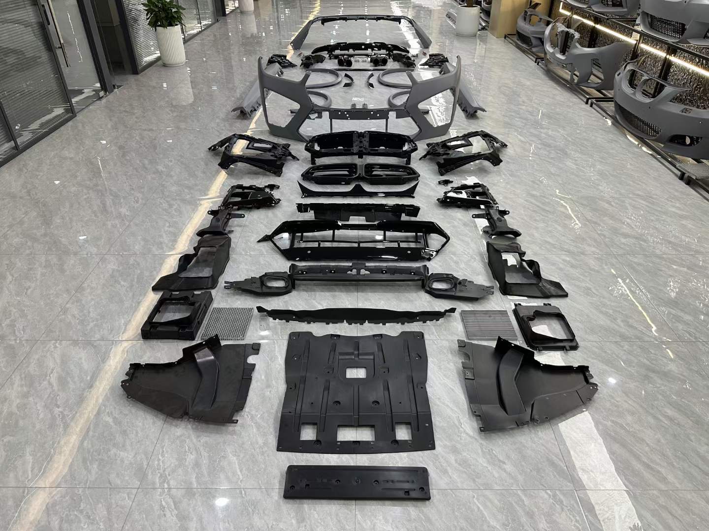 - Comprehensive kit includes front bumper, rear bumper, and necessary mounting trim components for a full aesthetic transformation.
